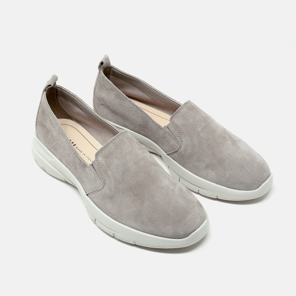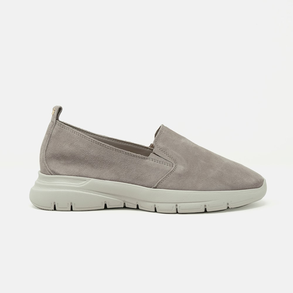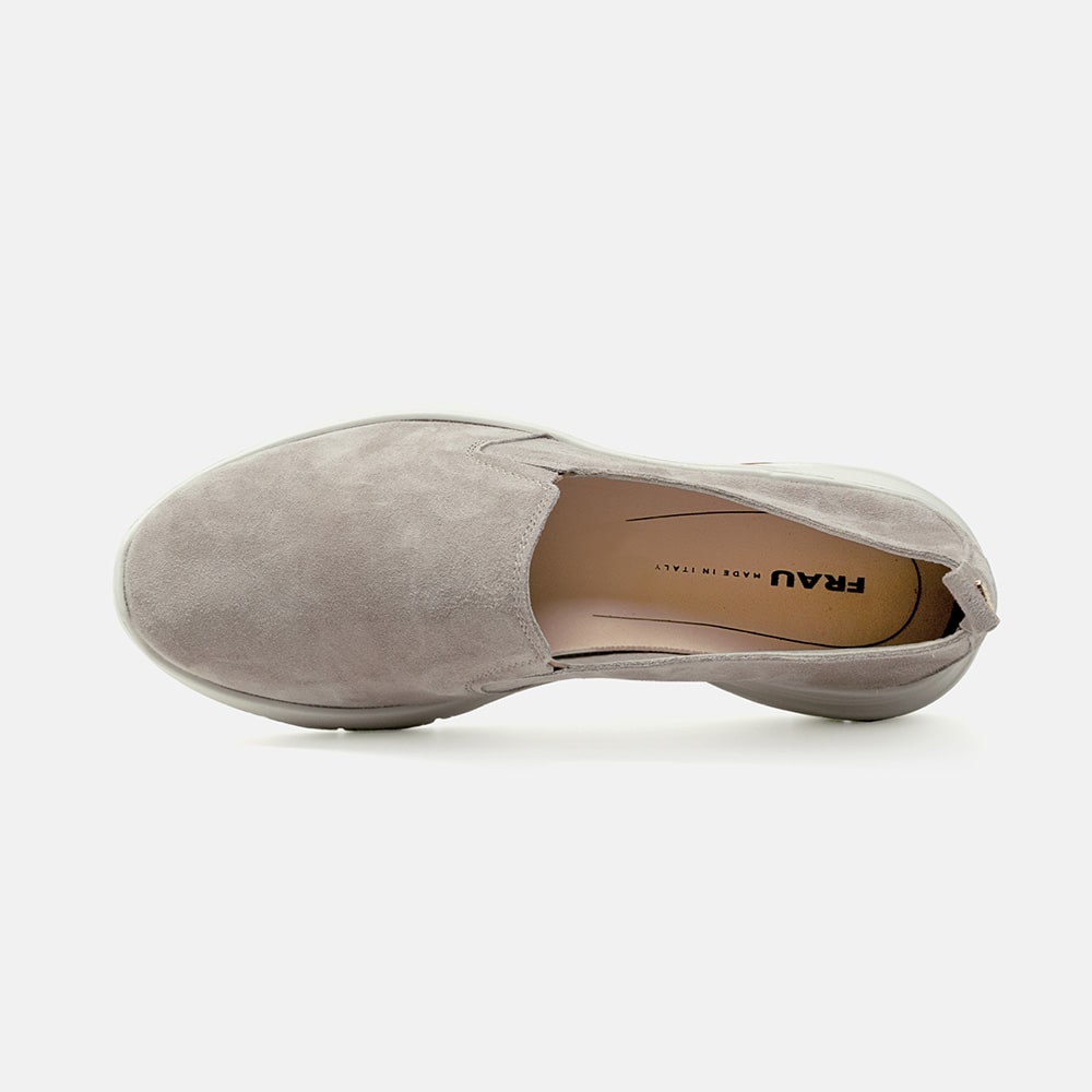 Scarpa slip-on Frau donna in morbida pelle scamosciata di colore "ecrù", con elastici bilaterali per facilitare la calzata, molto comoda e leggera. Prodotto in Italia.