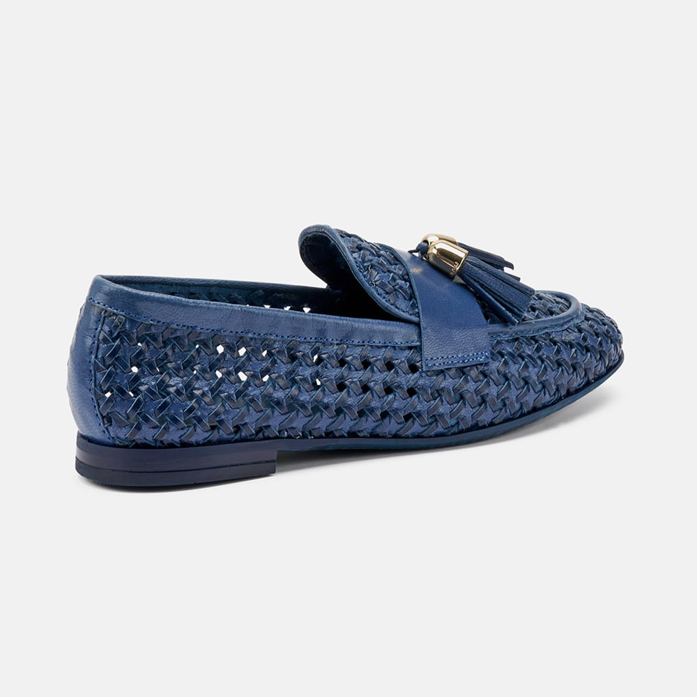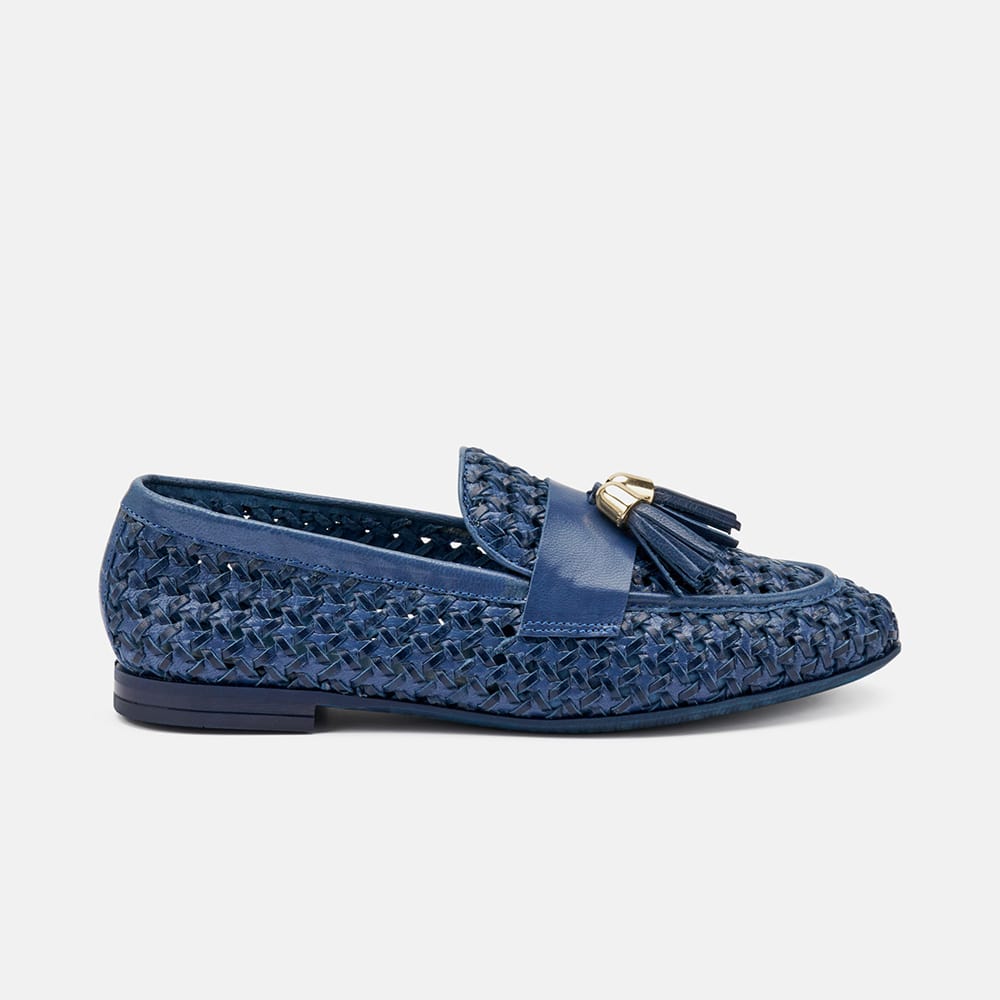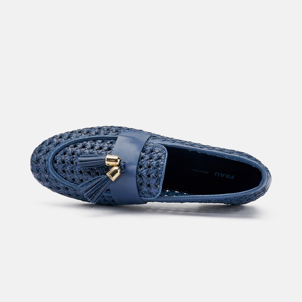 Mocassino Frau donna in pelle intrecciata di colore beige con nappine. Calzatura raffinata e moderna dalle caratteristiche uniche. Qualità made in Italy.
