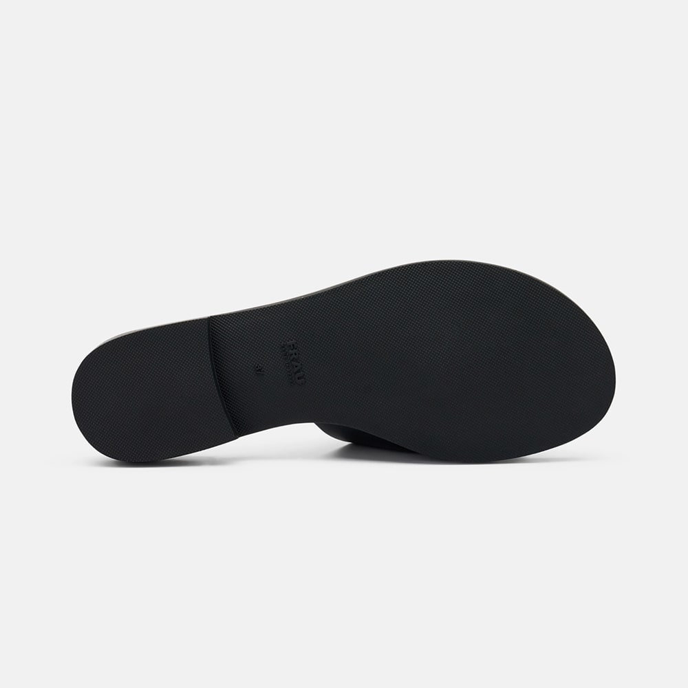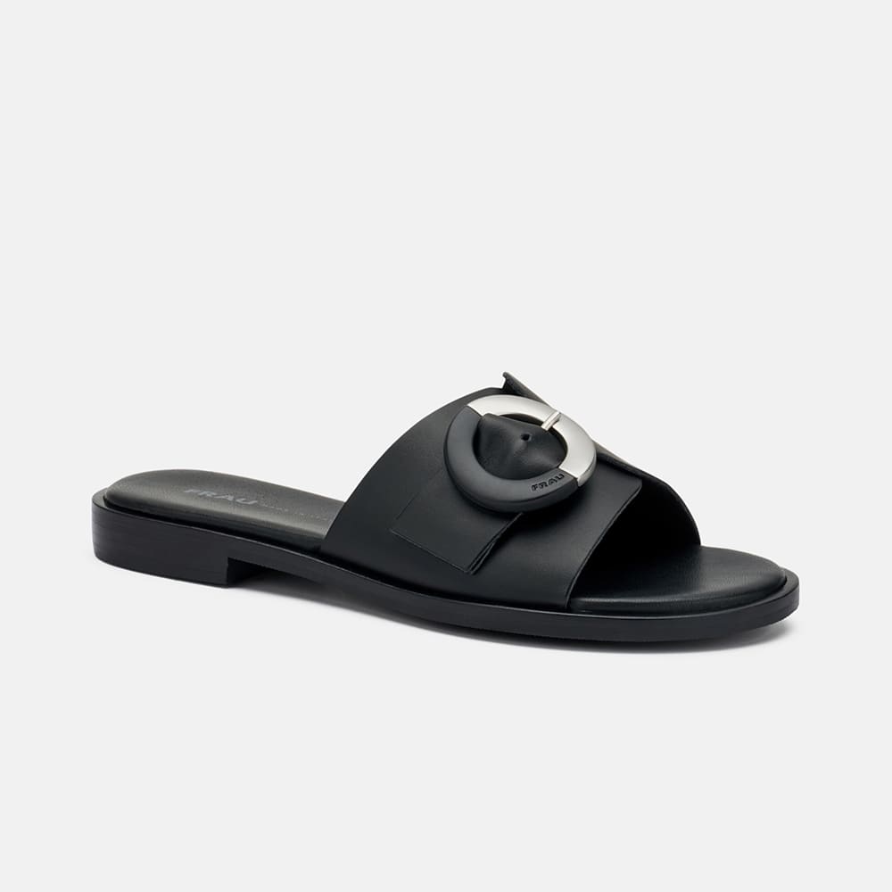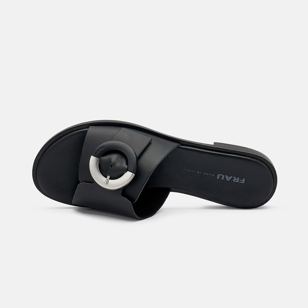 Ciabatta Frau donna in pelle a fascia di colore nero con maxi fibbia in tinta dal moderno design a semisfere. Tacco basso e sottopiede foderato in pelle imbottito. Ciabatta femminile e moderna da indossare tutto il giorno.