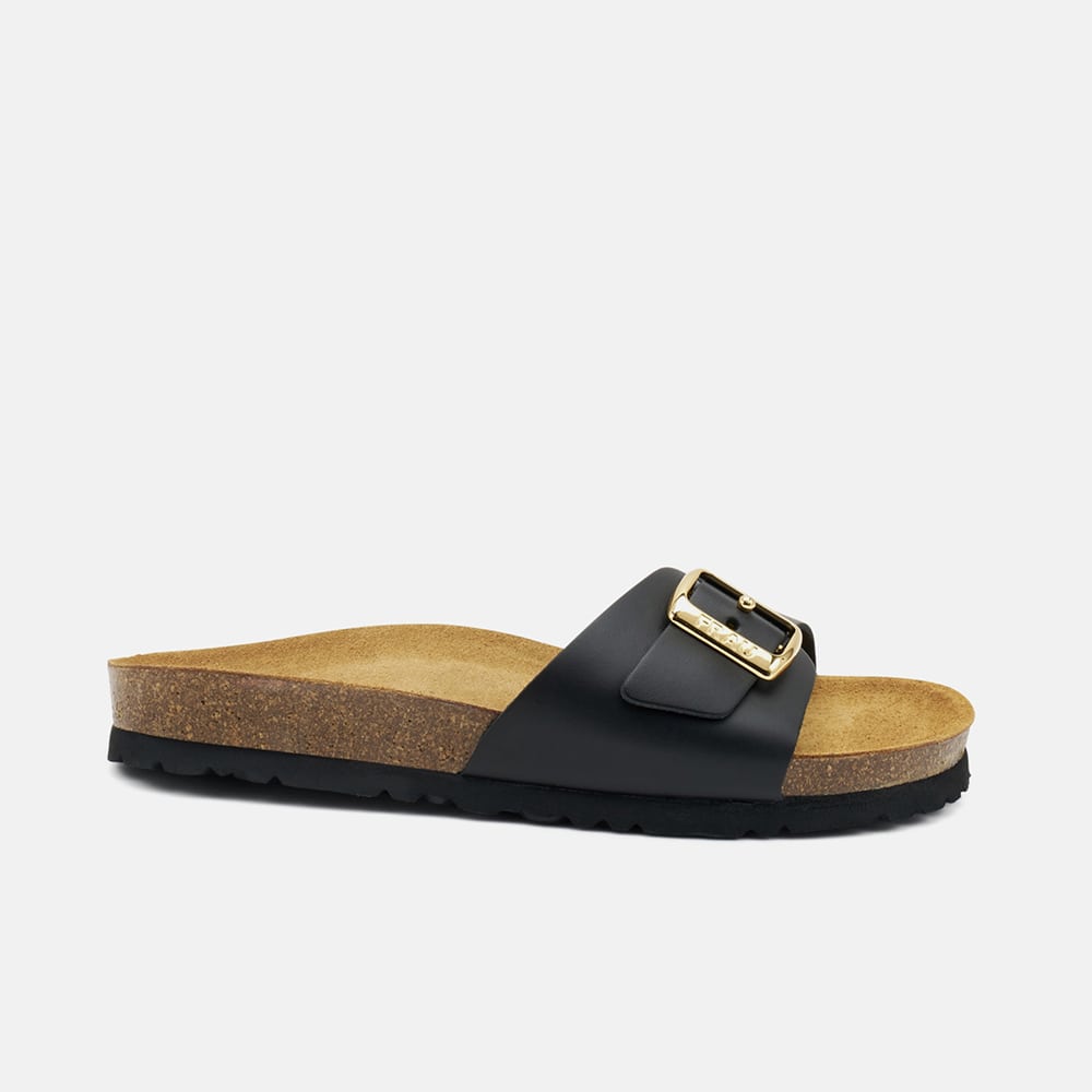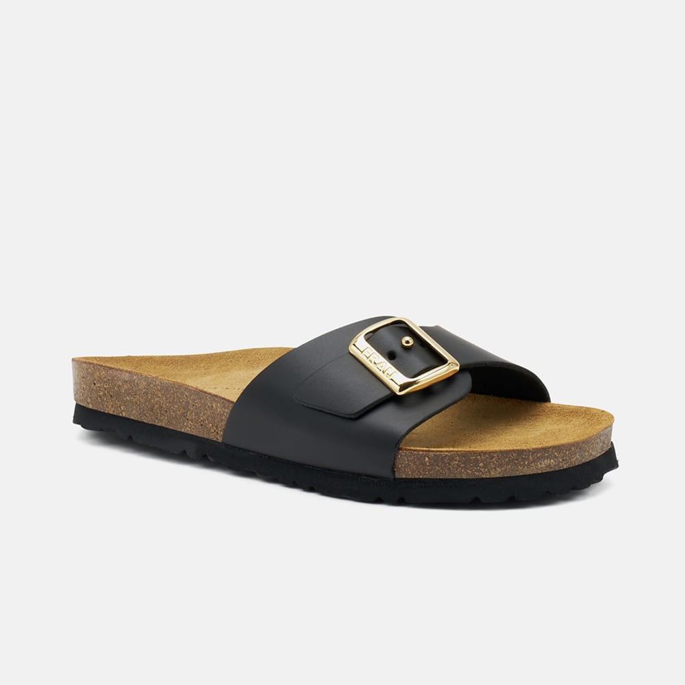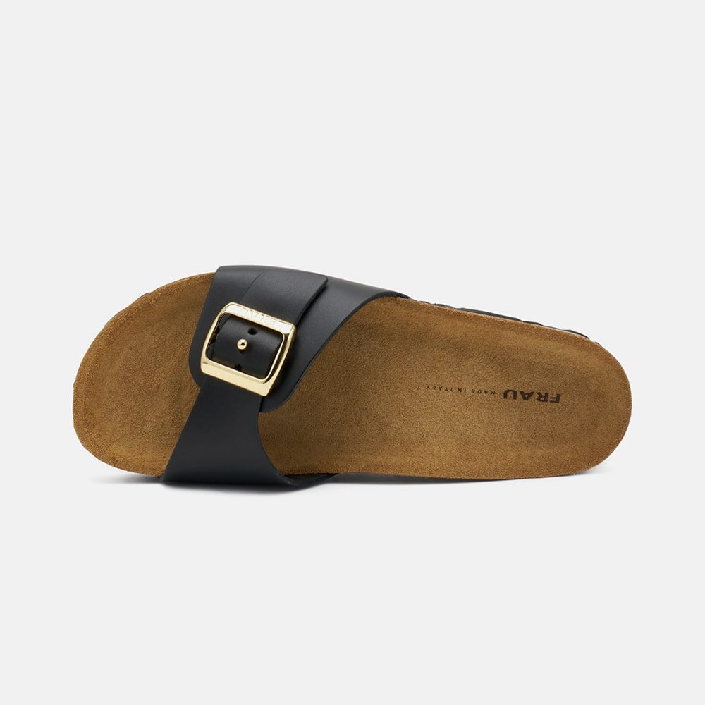 Ciabatta Frau donna a doppia fascia in pelle di colore nero con fibbia in oro; le due fasce sono regolabili per garantire una calzata più confortevole. Tacco basso e plantare anatomico imbottito effetto cuscinetto. Ciabatta comodissima da indossare tutto il giorno in città o in vacanza per un comfort eccezionale.