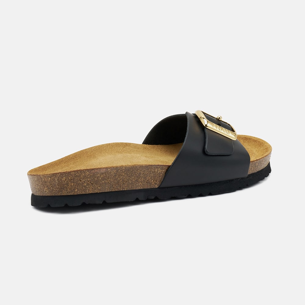 Ciabatta Frau donna in pelle a fascia di colore nero con maxi fibbia in tinta dal moderno design a semisfere. Tacco basso e sottopiede foderato in pelle imbottito. Ciabatta femminile e moderna da indossare tutto il giorno.