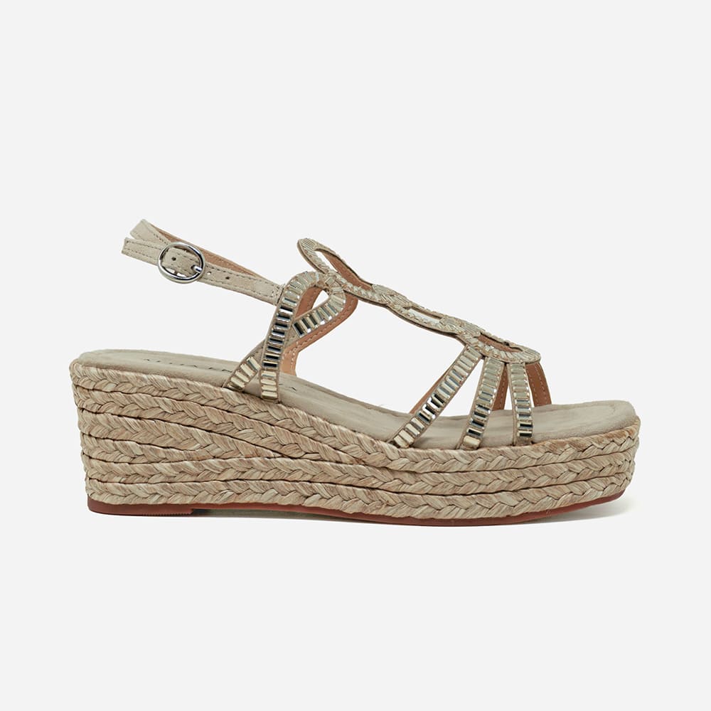 Sandalo donna Alma en Pena in pelle scamosciata di colore beige, con strass, zeppa media in rafia intrecciata. Sandali eleganti, comodi e perfetti per le tue serate estive.