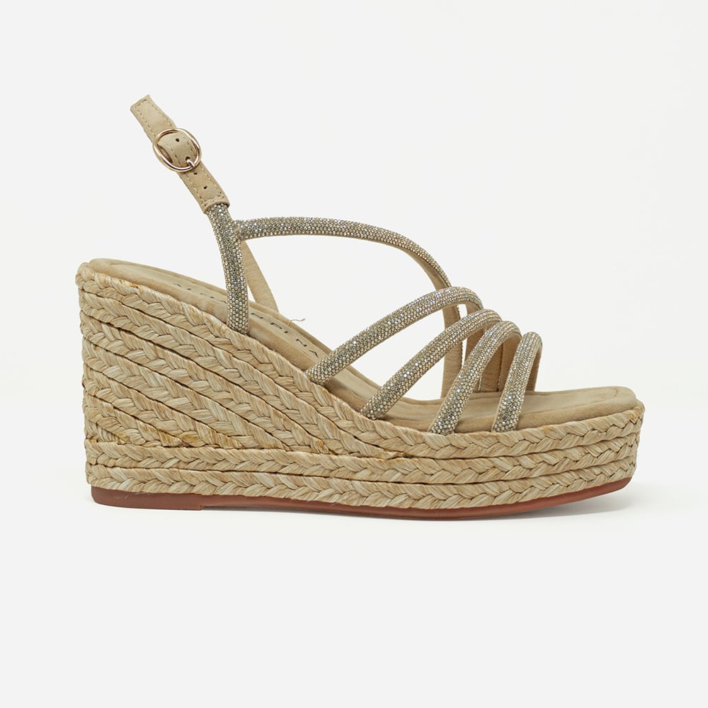 Sandalo gioiello donna Alma en Pena in pelle scamosciata di colore sabbia, con cinturini in strass a strisce, effetto specchio. Sandalo con zeppa alta 9,8 cm in rafia intrecciata, chiusura con fibbia sulla caviglia. Eleganti, comodi e perfetti per le tue serate estive.