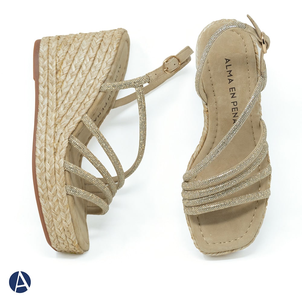 Sandalo donna Alma en Pena in pelle scamosciata di colore beige, con strass, zeppa media in rafia intrecciata. Sandali eleganti, comodi e perfetti per le tue serate estive.