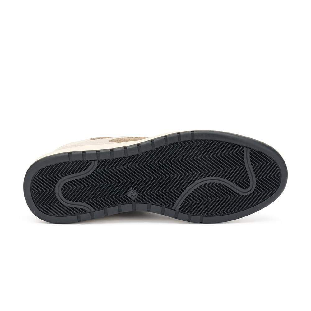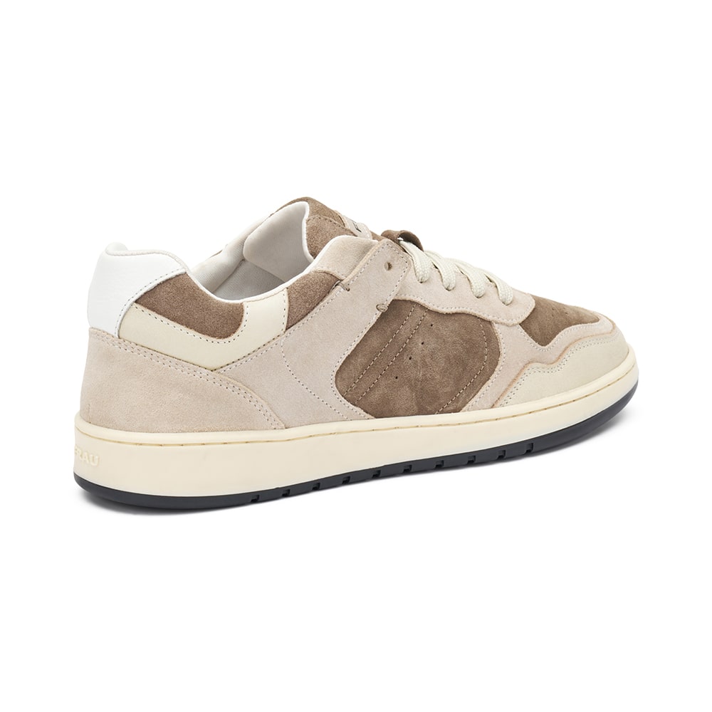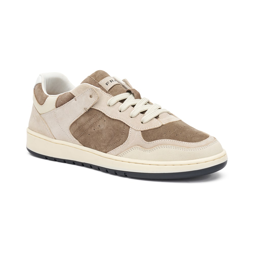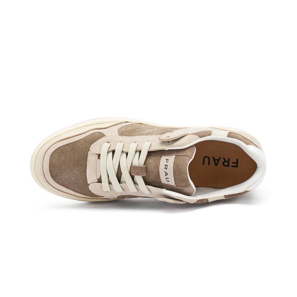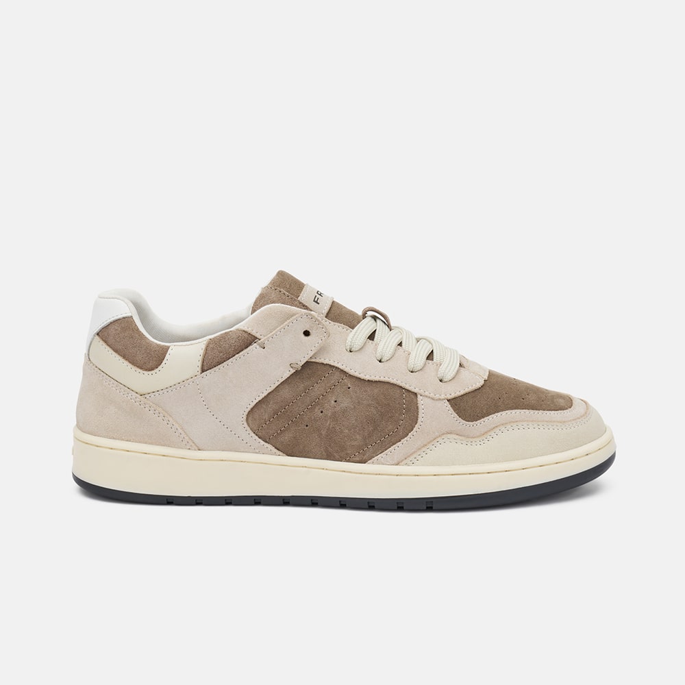 Sneakers uomo Frau in pelle scamosciata di colore beige con inserti e contrasti di texture, riporti in pelle bianca sul tallone. Comoda calzatura dalle linee pulite, ispirate ai modelli tennis degli anni '80. MADE IN ITALY.
