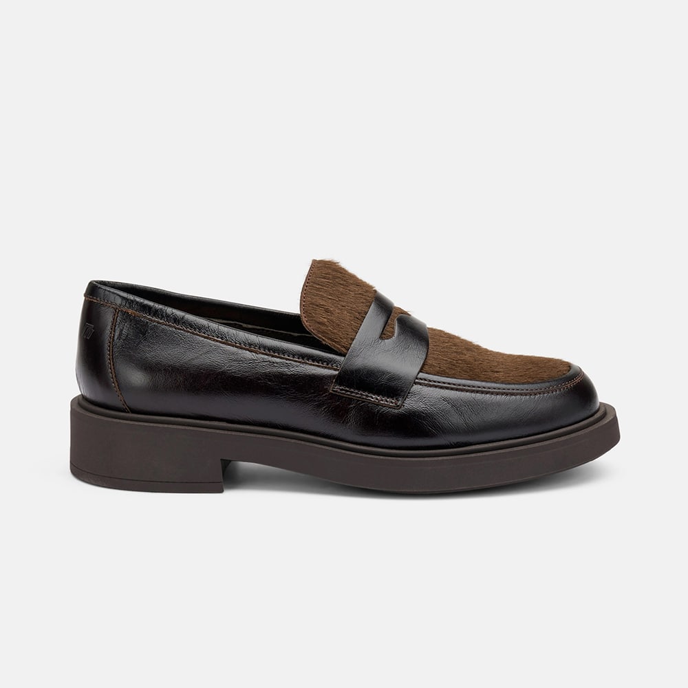 Mocassino Frau donna in pelle stropicciata di colore Testa di Moro con inserti in pelle cavallino. Alternativa al classico mocassino con morsetto. Divertente e sbarazzino che rispecchia il trend della moda MADE IN ITALY.