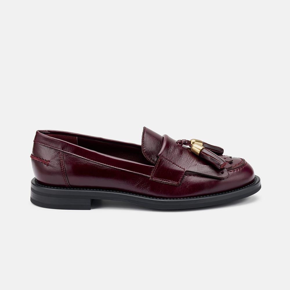 Mocassino Frau donna in pelle di colore bodeaux con frangia e nappine. Alternativa al classico mocassino con morsetto. Divertente e sbarazzino che rispecchia il trend della moda MADE IN ITALY.