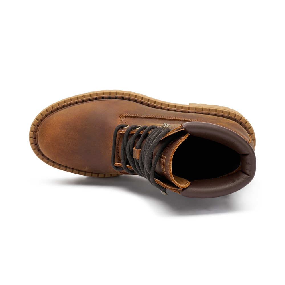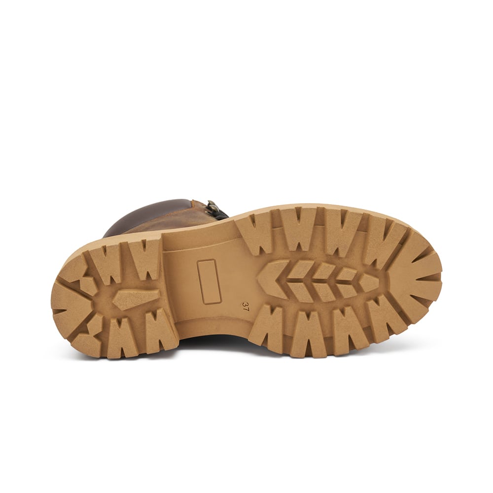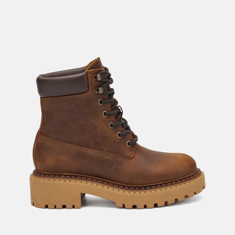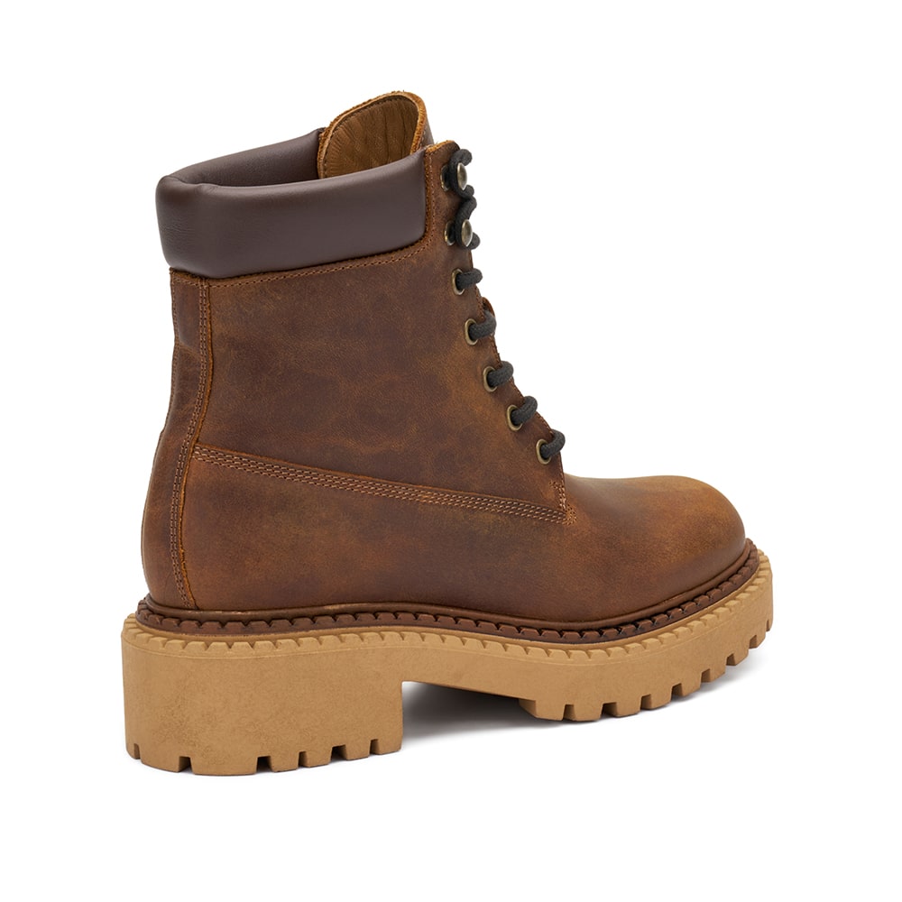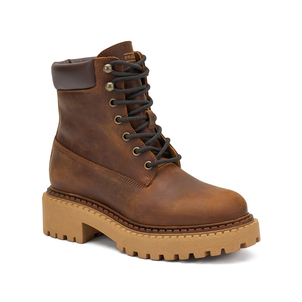 Stivaletto Frau donna in morbida pelle ingrassata di colore cuoio, con suola doppio guardolo, tacco 5 cm, fondo carrarmato. Perfetti per le escursioni in montagna così come per un look metropolitano. Calzatura MADE IN ITALY.