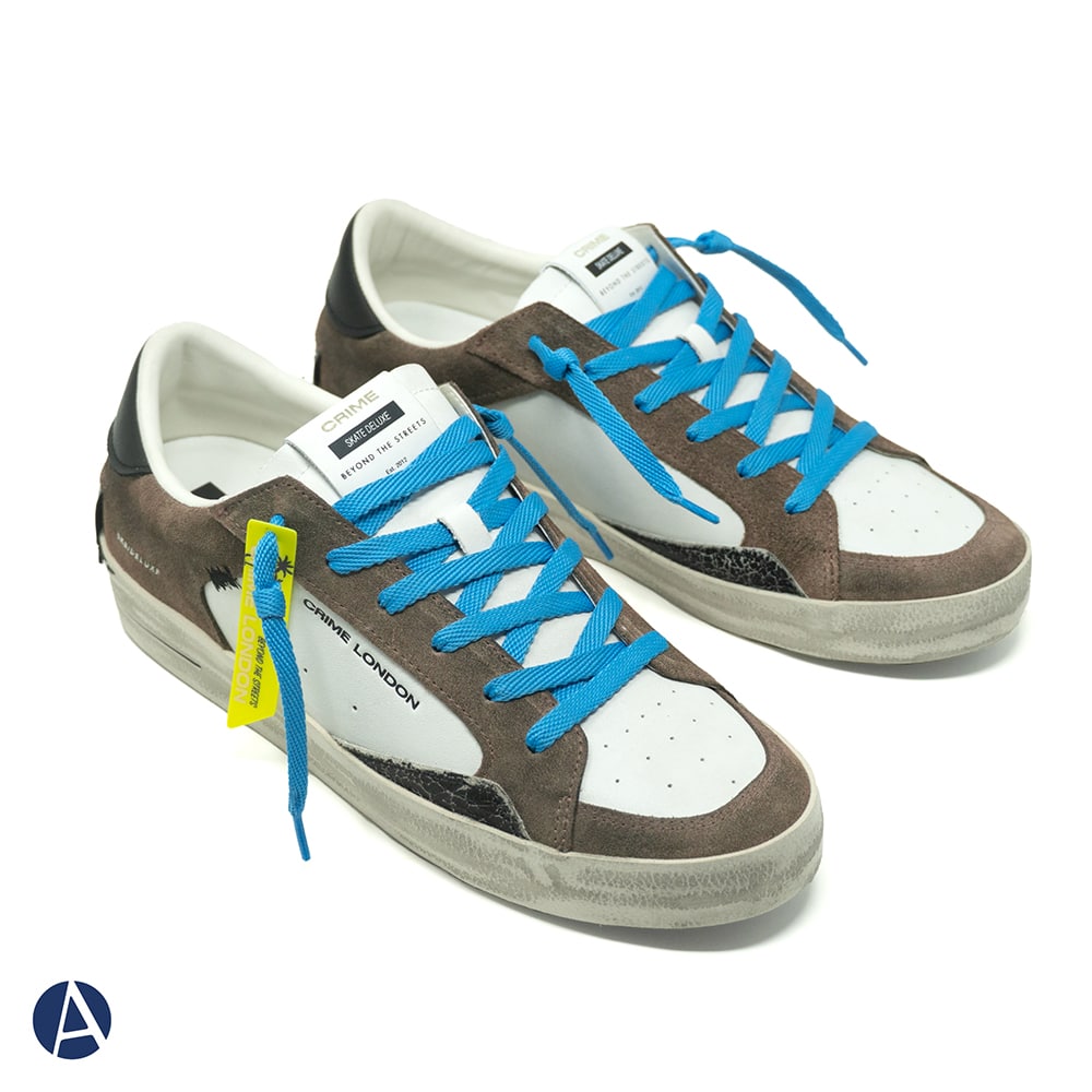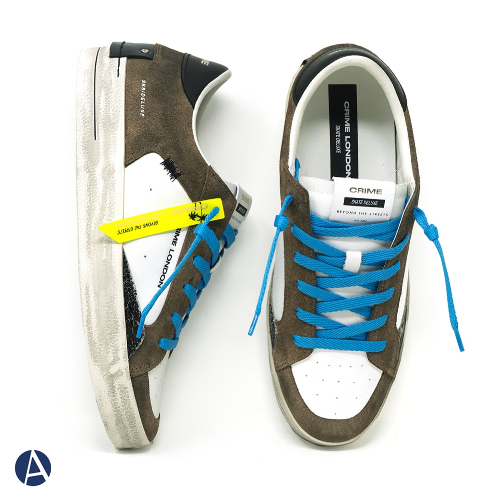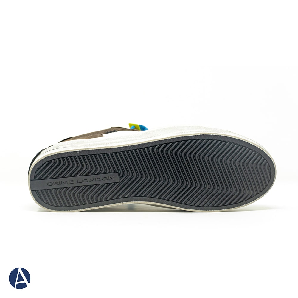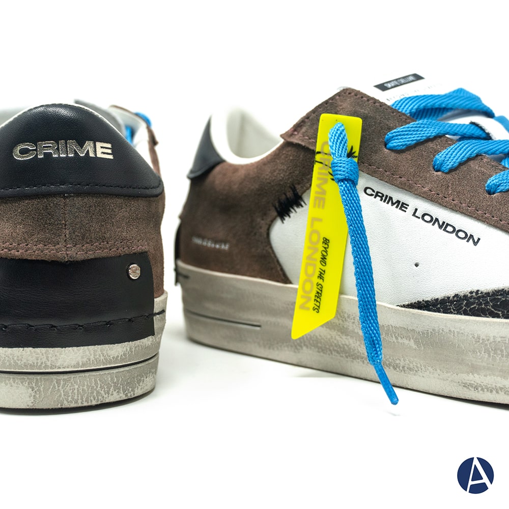 Sneakers Uomo Crime London Chelsea fall city in camoscio e pelle bianca con dettagli in pelle scamosciata beige, taupe e nero. Riporti sul tallone in pelle nero con logo. Punta traforata e lacci taupe. Realizzata con materiali di alta qualità Made in Italy.
