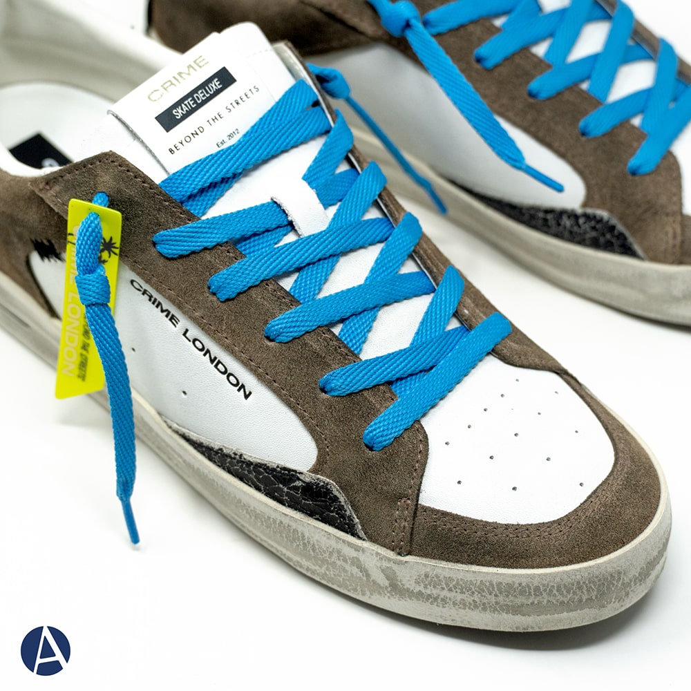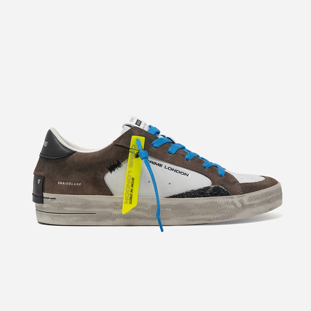Sneakers Uomo Crime London SK8 Deluxe No Sleep in pelle nera con dettagli in suede sabbia. Riporti sul tallone in pelle bianca con logo argento. Patch in pelle nera fissato con micro viti e linguetta in tessuto blu elettrico. Punta traforata e lacci beige. Realizzata con materiali di alta qualità Made in Italy.