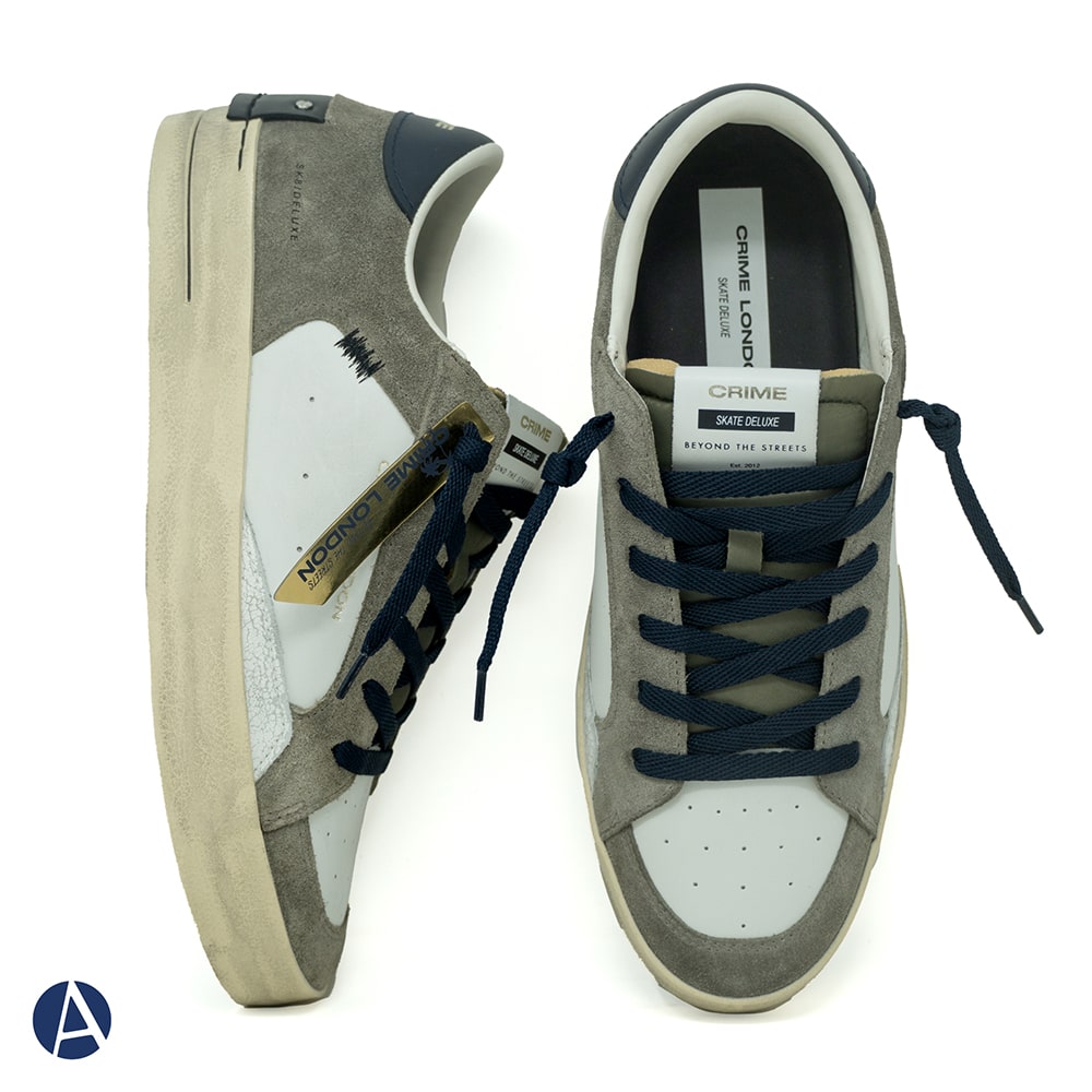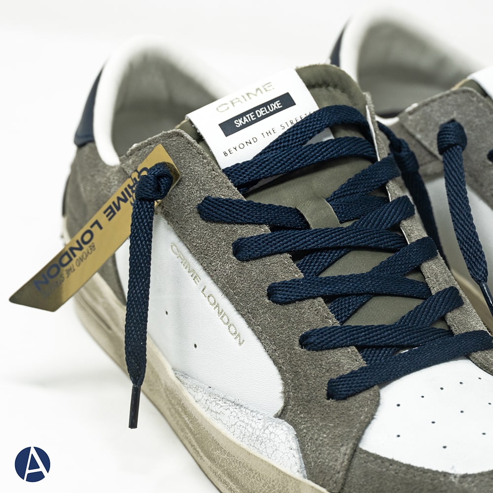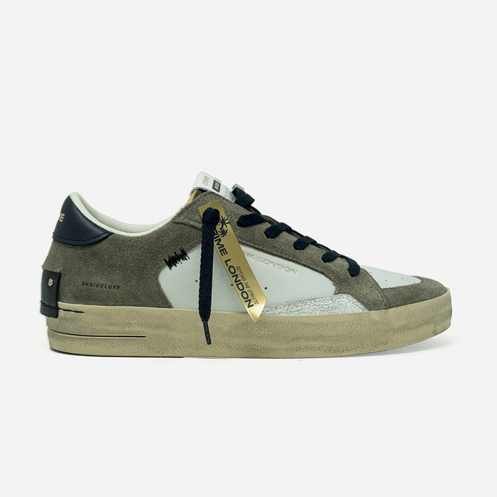 Sneakers Uomo Crime London SK8 Deluxe Cocoa Mist in pelle bianca con dettagli in pelle scamosciata marrone e cracklè nero. Lacci azzurri ( in dotazione anche grigi), punta traforata e riporti sul tallone in pelle nera con logo argento. Patch in pelle nera fissato con micro viti. Realizzata con materiali di alta qualità Made in Italy.