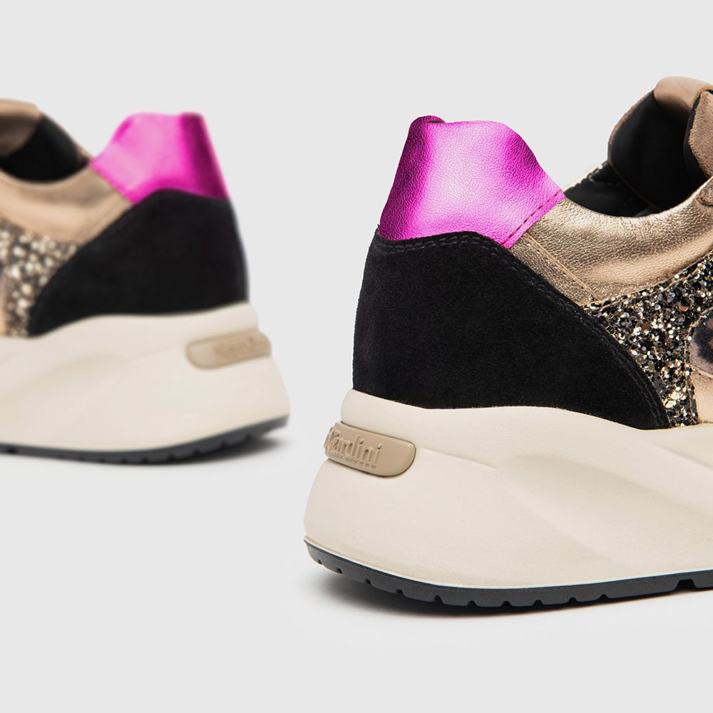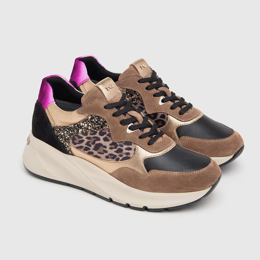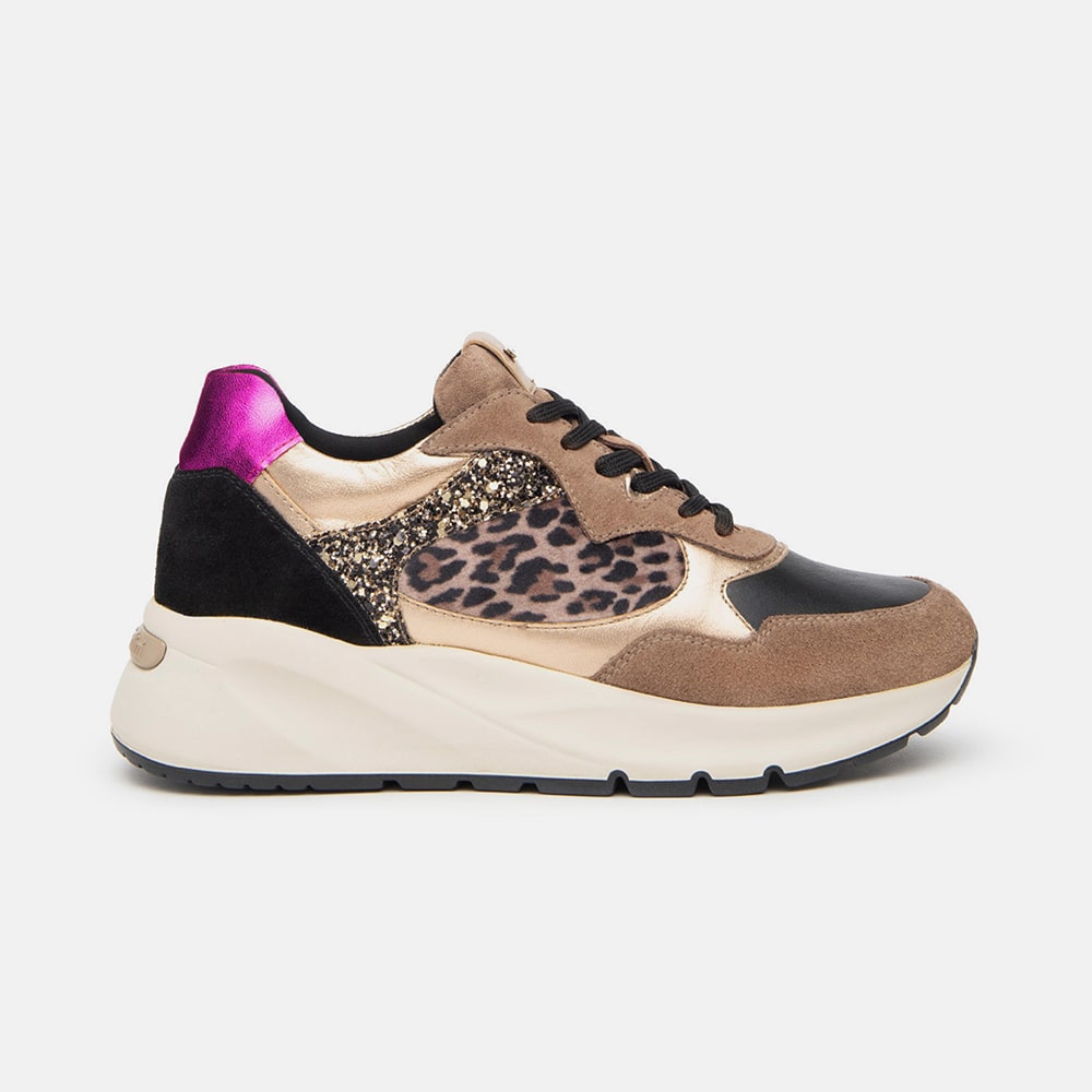 Sneakers donna NeroGiardini realizzate in suede, pelle e materiale tecnico con riporti leopardati, platino, glitter oro, taupe, zeppa media, fondo ginnico e riporti marrone sul tallone. Sneakers estremamente comode da indossare tutto il giorno. Calzature MADE IN ITALY realizzate con materiali di alta qualità.