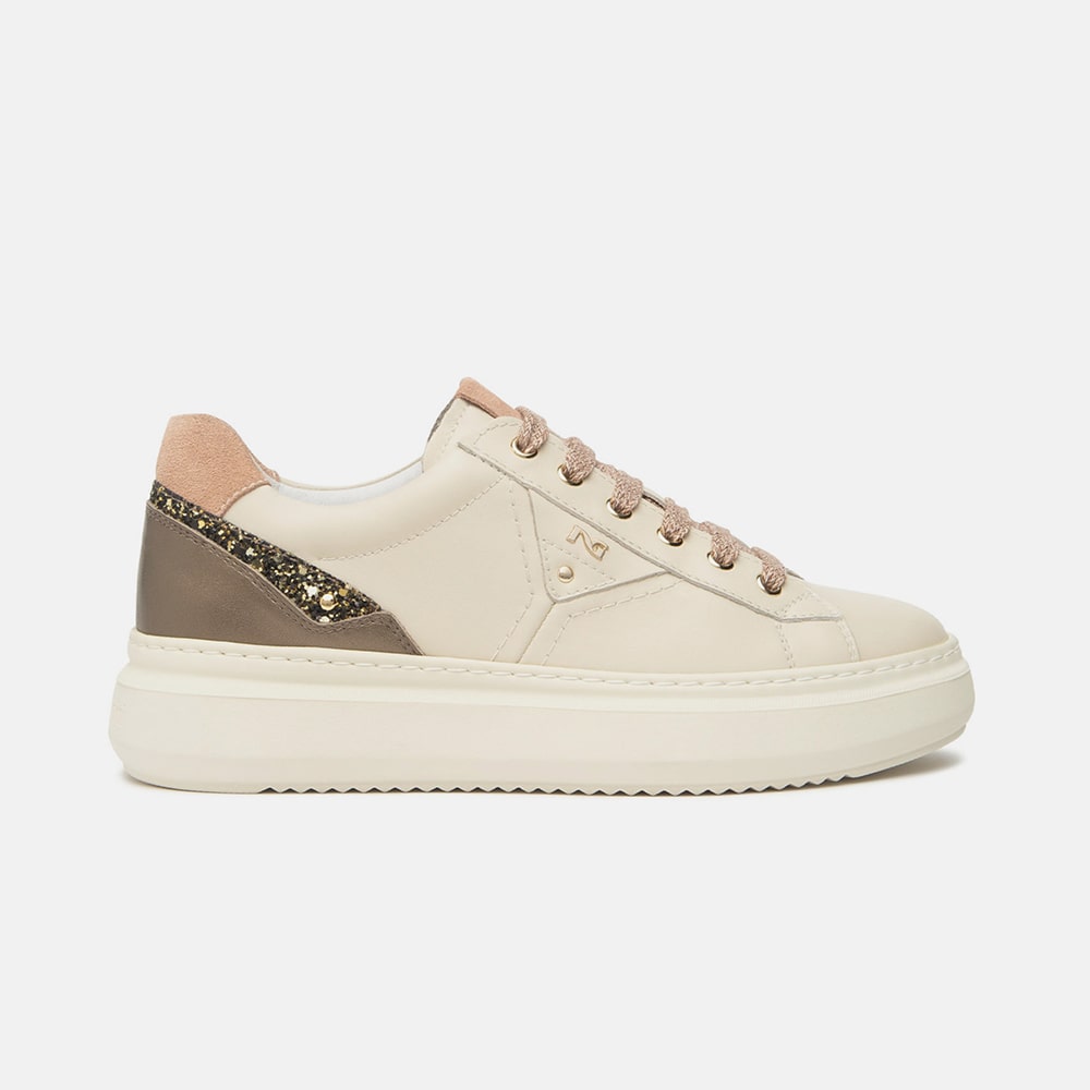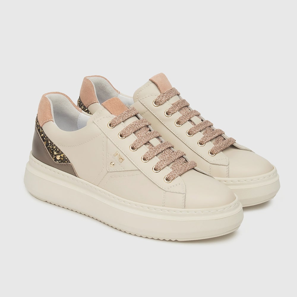 Sneakers donna NeroGiardini in pelle avorio, suede, materiale tecnico e lacci, riporti scamosciati di colore sigaro e rosa sul tallone, impreziositi da glitter che rendono la calzatura femminile e glamour. Sneakers estremamente comode da indossare realizzate con materiali di alta qualità. MADE IN ITALY