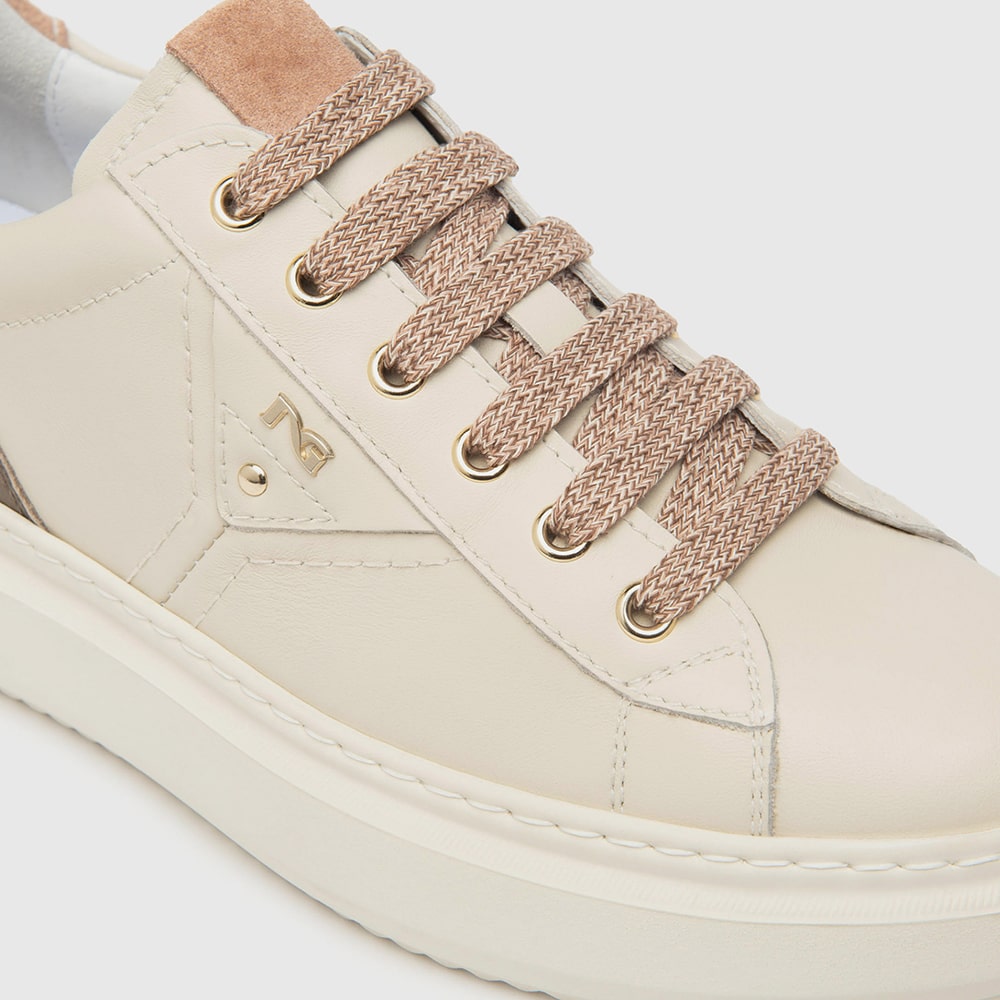 Sneakers donna NeroGiardini in pelle avorio, materiale tecnico e lacci, stampa logata laterale e fascia di colore cuoio. Tallone in laminato colore oro. Sneakers estremamente comode da indossare tutto il giorno realizzate con materiali di alta qualità. MADE IN ITALY