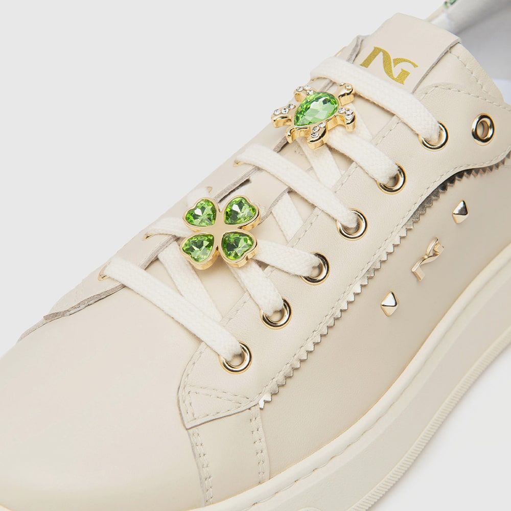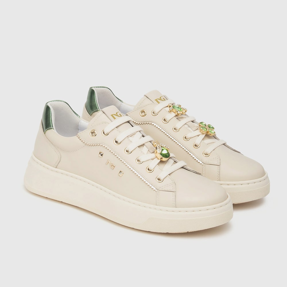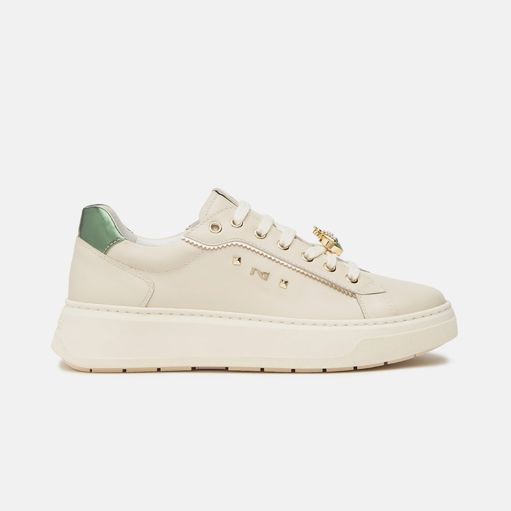 Sneakers donna NeroGiardini in pelle colore Milk con lacci, stampa laterale e riporti di colore verde salvia. Tallone in laminato color platino con elementi metallici di colore oro. Sneakers alla moda estremamente comode da indossare. MADE IN ITALY realizzate con materiali di alta qualità.