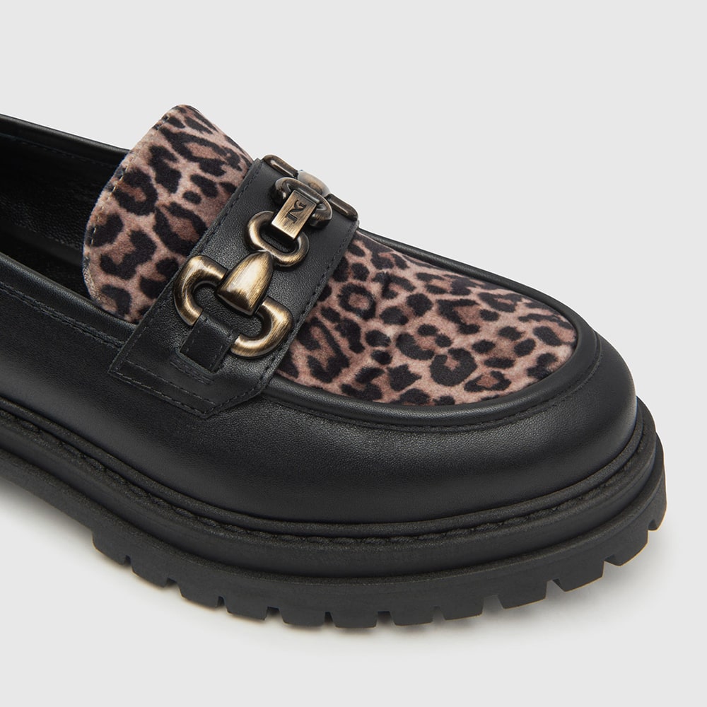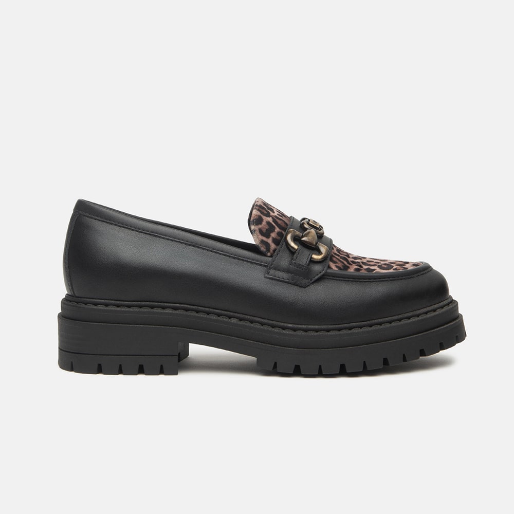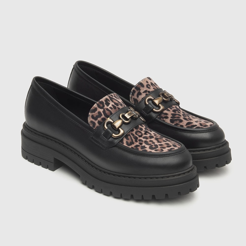 Mocassino donna NeroGiardini in pelle colore nero, con riporti leopardati e morsetto oro, tacco a blocco 4 cm, fondo carrarmato. Scarpa dallo siile unico comodissima da indossare tutto il giorno. Calzature donna MADE IN ITALY realizzate con materiali di alta qualità.