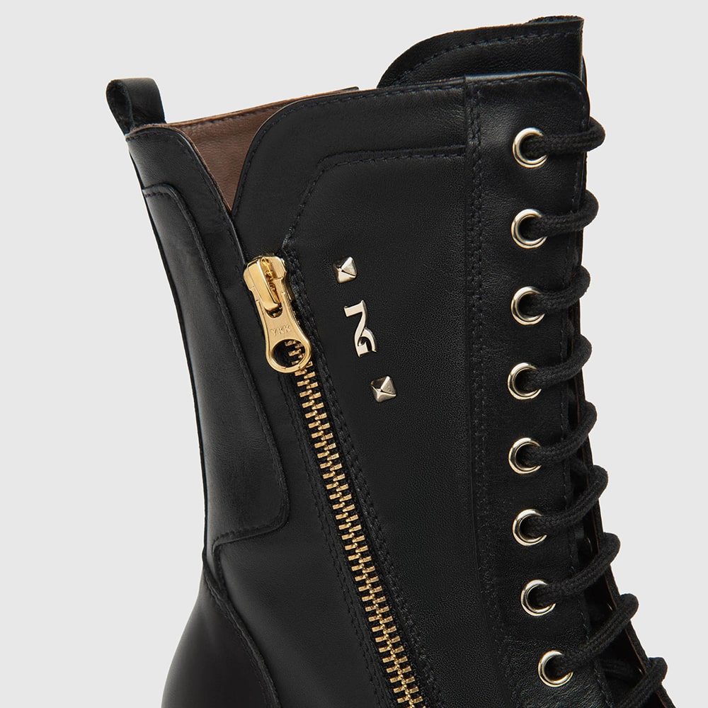 Anfibi donna NeroGiardini in morbida pelle nera con lacci, fondo carrarmato, accessorio in tinta brandizzato e zip laterale per rendere la calzata ancora più comoda. Tacco a blocco 3 cm. Stivaletti donna bellissimi che non possono mancare nel tuo guardaroba! Calzatura MADE IN ITALY realizzata con materiali di alta qualità