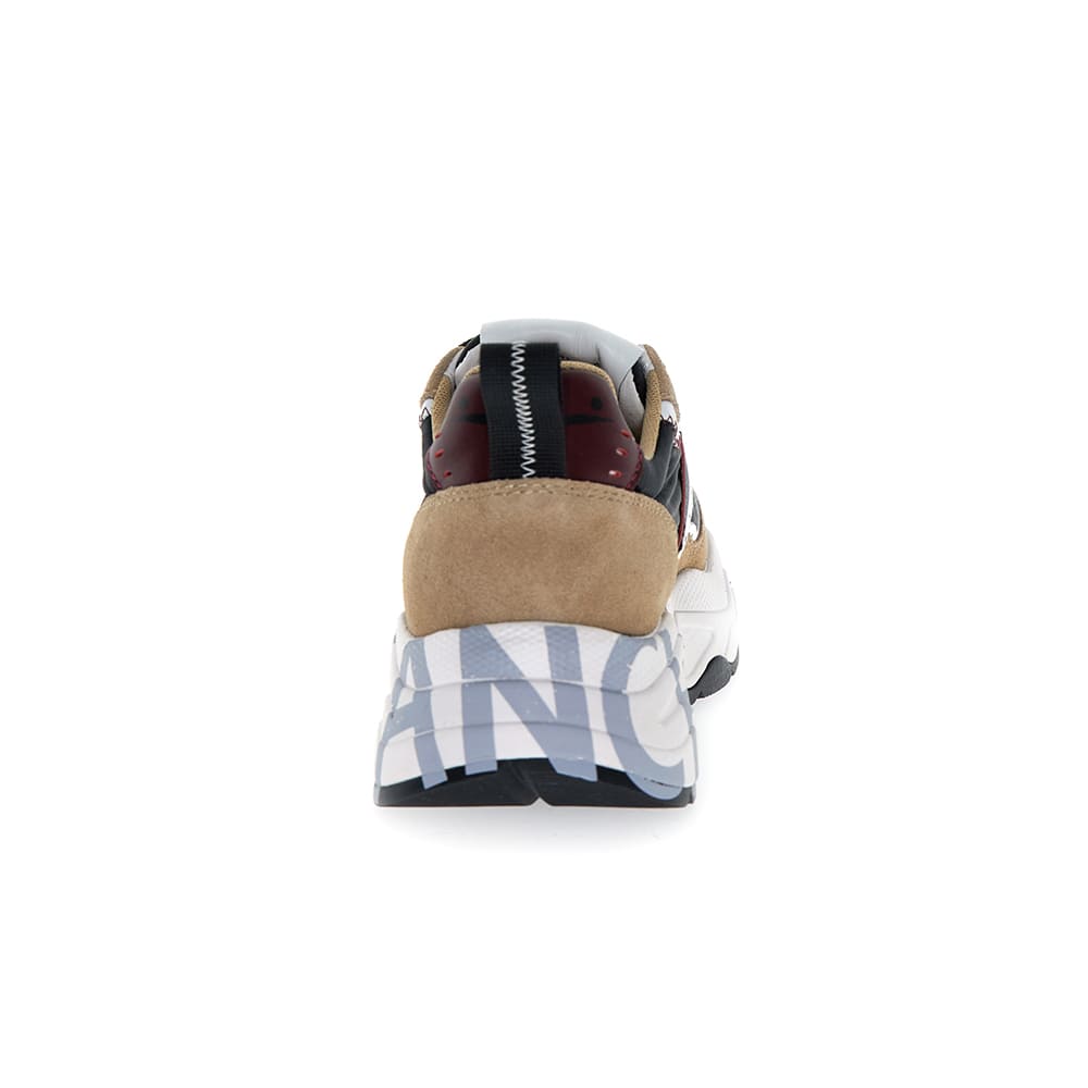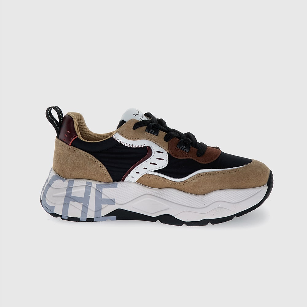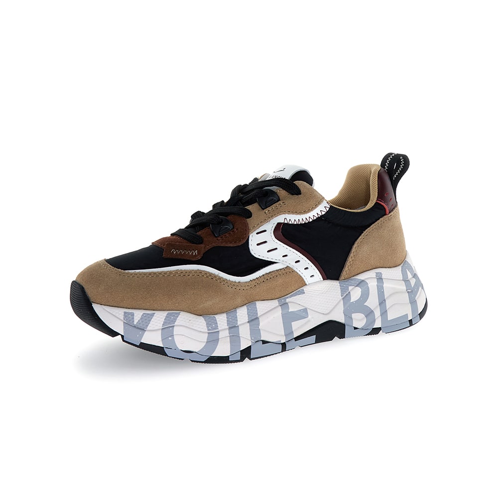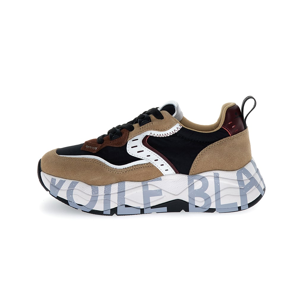 Sneakers donna Voile Blanche Club105 in suede e tessuto tecnico colore marrone-beige con lacci a contrasto. Borchie piatte sul tallone con dettagli platino. Fondo alto con logo e suola a doppia altezza in gomma ultra leggera. Voile Blanche: il mix perfetto tra stile e funzionalità.