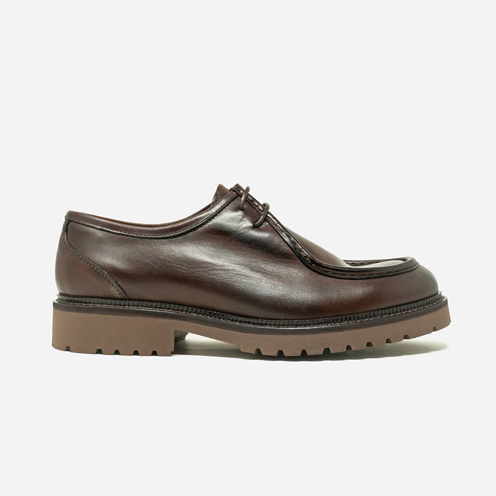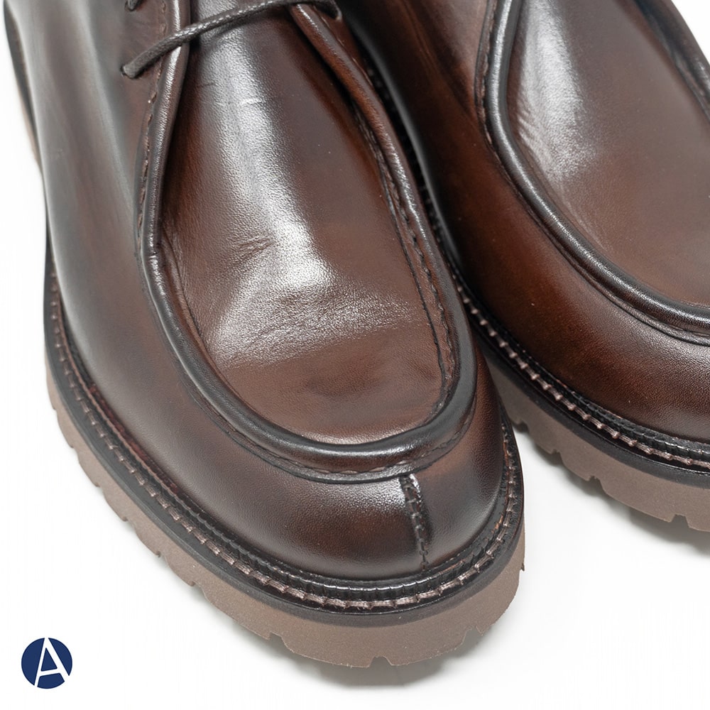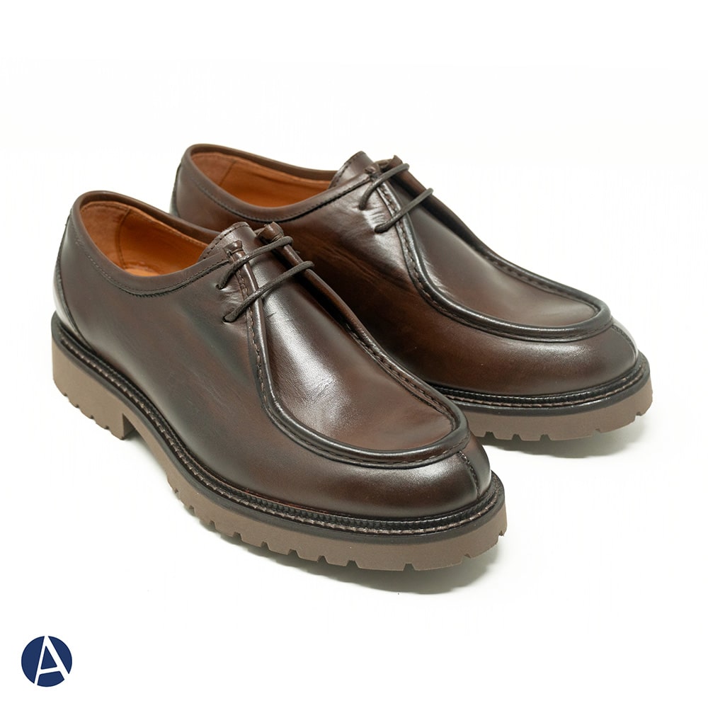 Mocassino da barca Exton uomo, stile britannico, in pelle di colore mogano con lacci. Fondo gomma con carrarmato. Comode ed eleganti. Calzature MADE IN ITALY