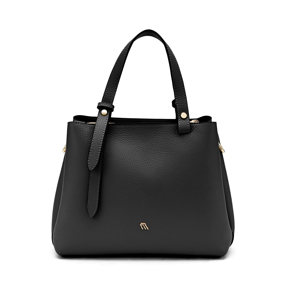 Borsetta donna Frau media in pelle bottalata di colore nero. Questa handbag è dotata di pratica tracolla con piedini d'appoggio in metallo sulla base. Due scomparti con chiusura magnetica, una tasca con zip. Made in Italy.