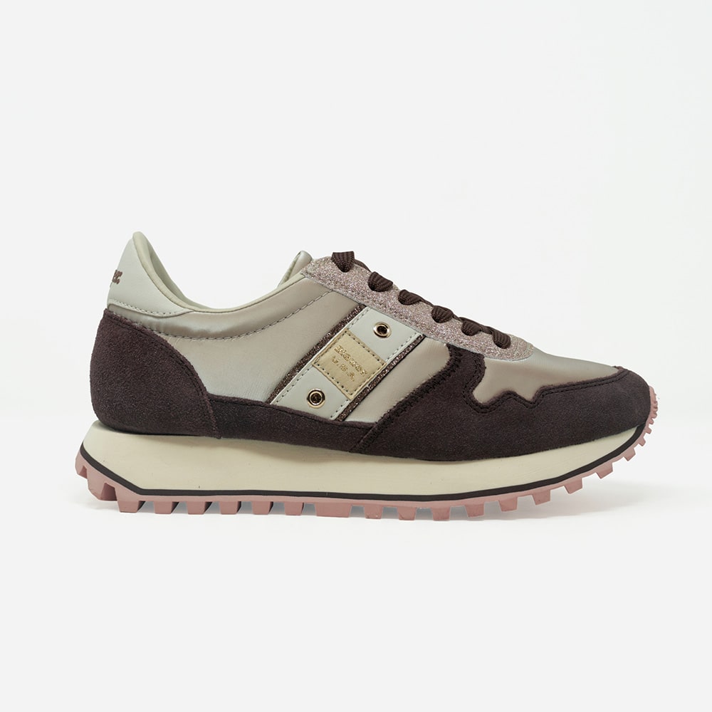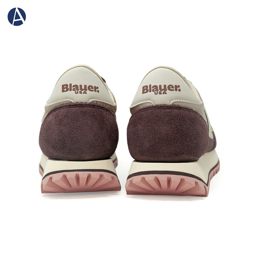Sneakers Blauer donna con riporti in pelle scamosciata di colore taupe, beige, bronzo e tessuto tecnico di colore avorio, riporti platino sul tallone, fascia laterale in pelle colore avorio con logo. Fondo running colorato, con doppio laccio in dotazione. Comodissima e leggera da indossare tutto il giorno oppure perfetta per il tuo outfit sportivo.