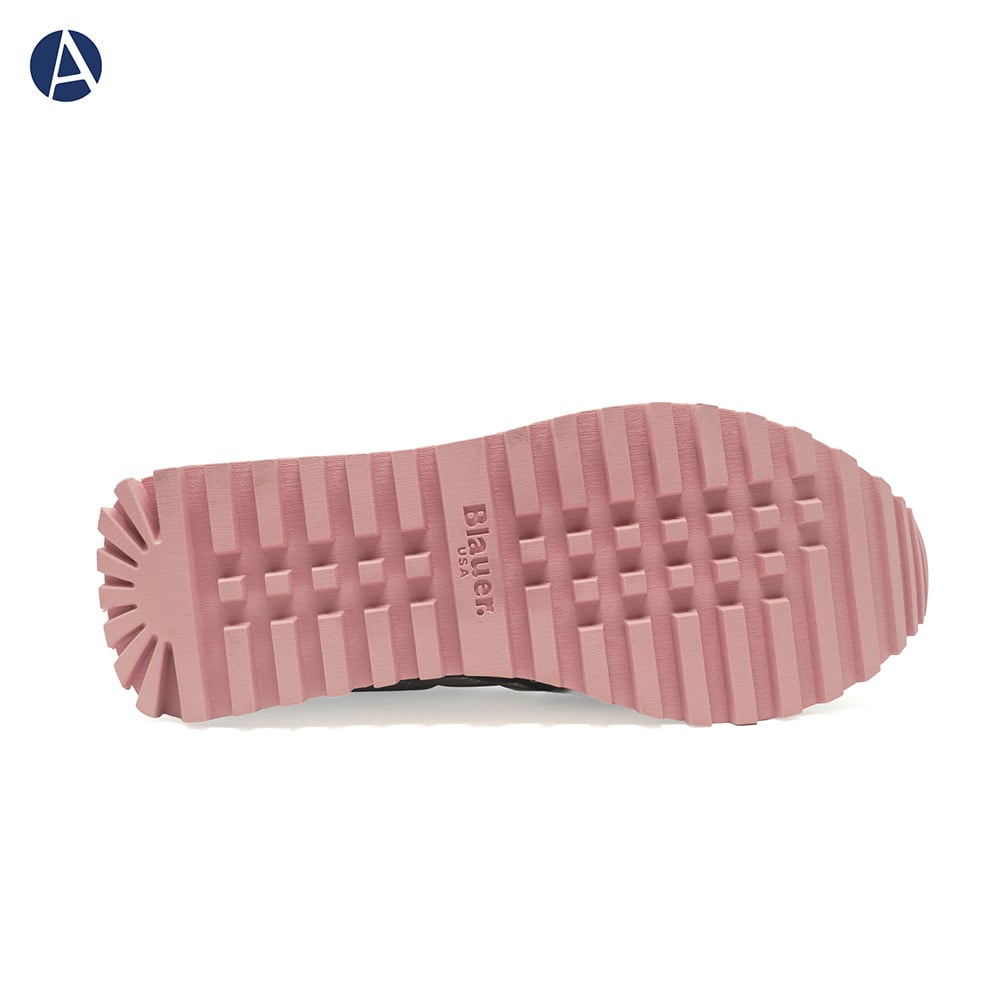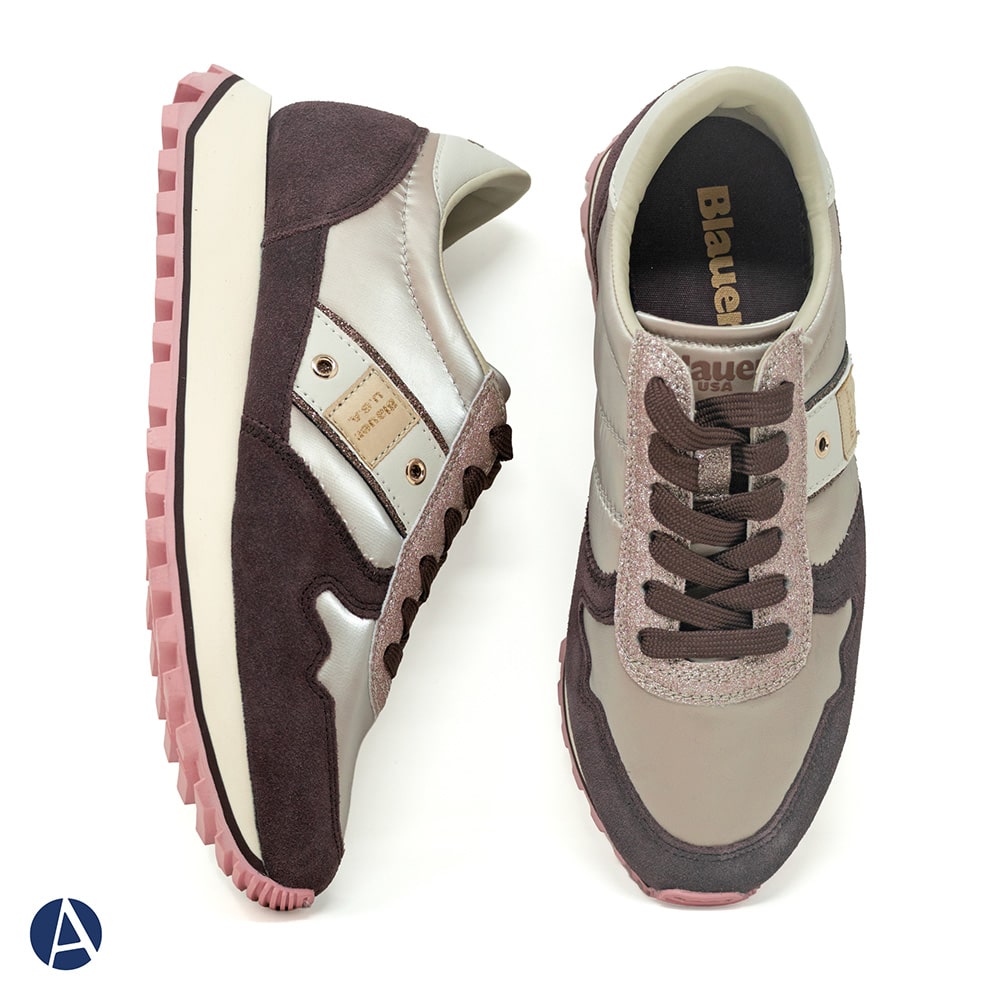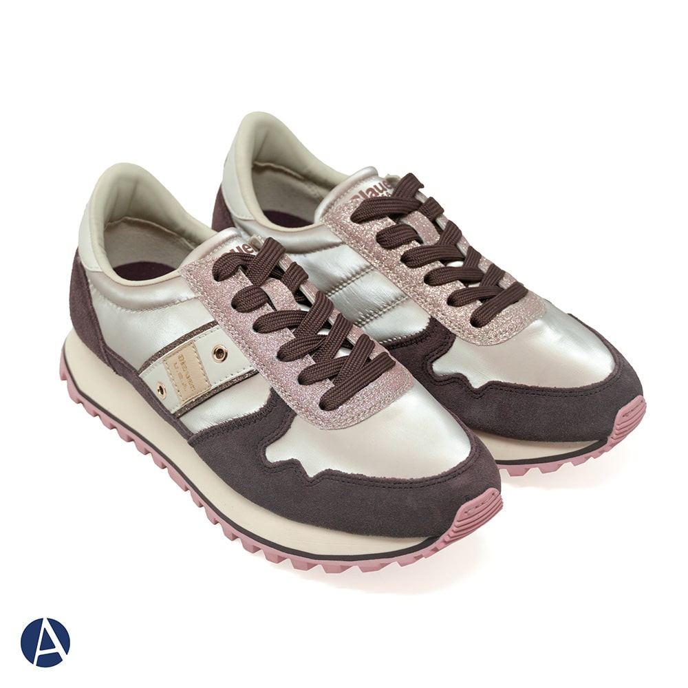 Sneakers Blauer donna con riporti in pelle scamosciata e tessuto tecnico di colore rosa e lilla, fascia laterale in pelle colore oro con logo e riporti glitterati di colore verde sul tallone, fondo running colorato. Comodissima e leggera da indossare tutto il giorno oppure perfetta per il tuo outfit sportivo.