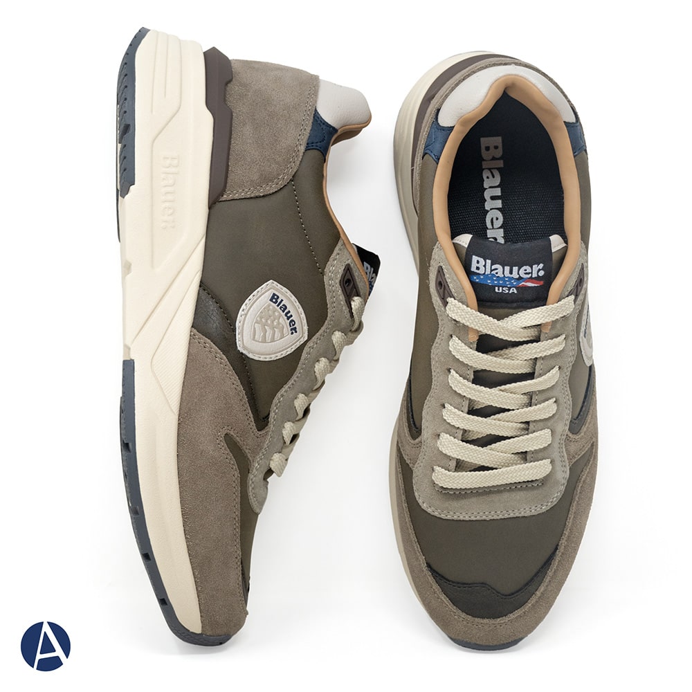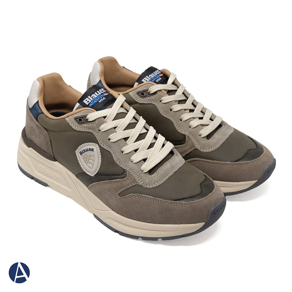 Blauer sneakers uomo sportive in tessuto tecnico e camoscio di colore verde militare con lacci colore avorio a contrasto, riporti blu sul tallone. Sneakers leggerissime, suola in EVA con elementi a contrasto e dentellata per un look dinamico. Perfette per chi ama calzature sportive originali dallo stile ricercato.