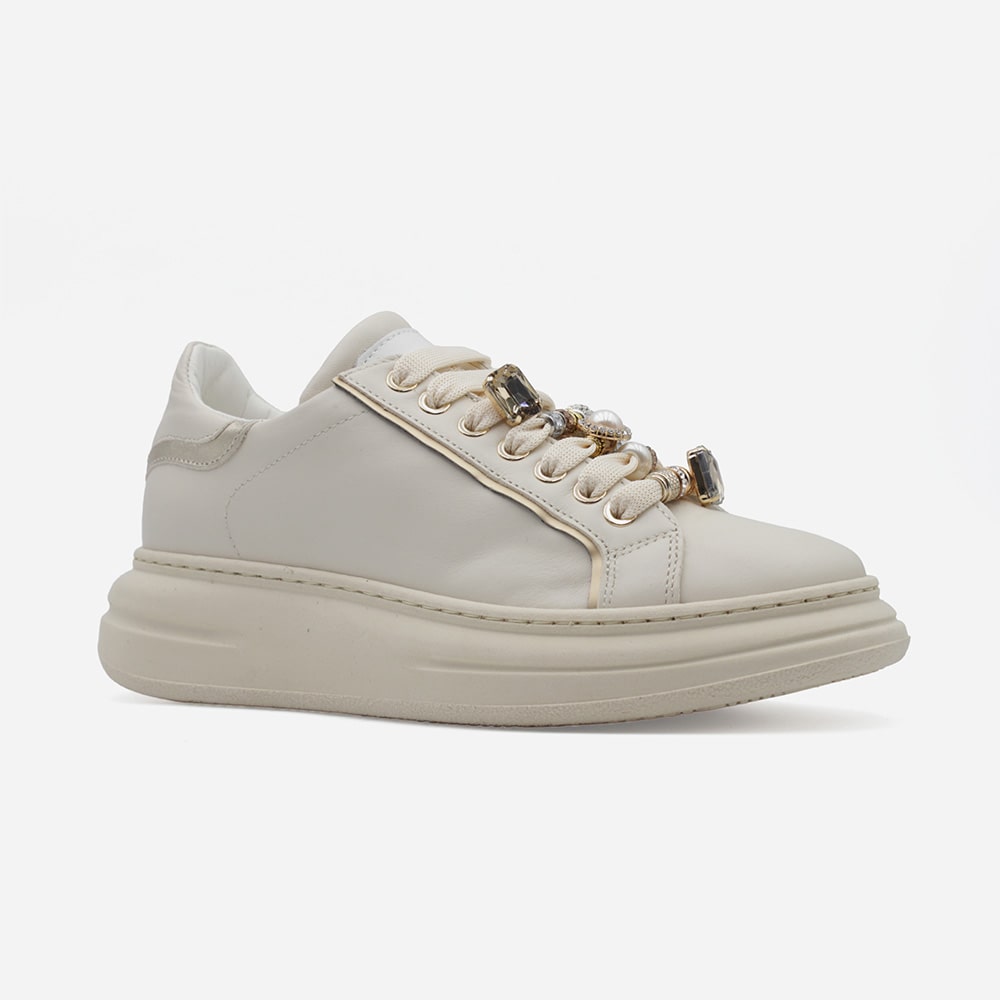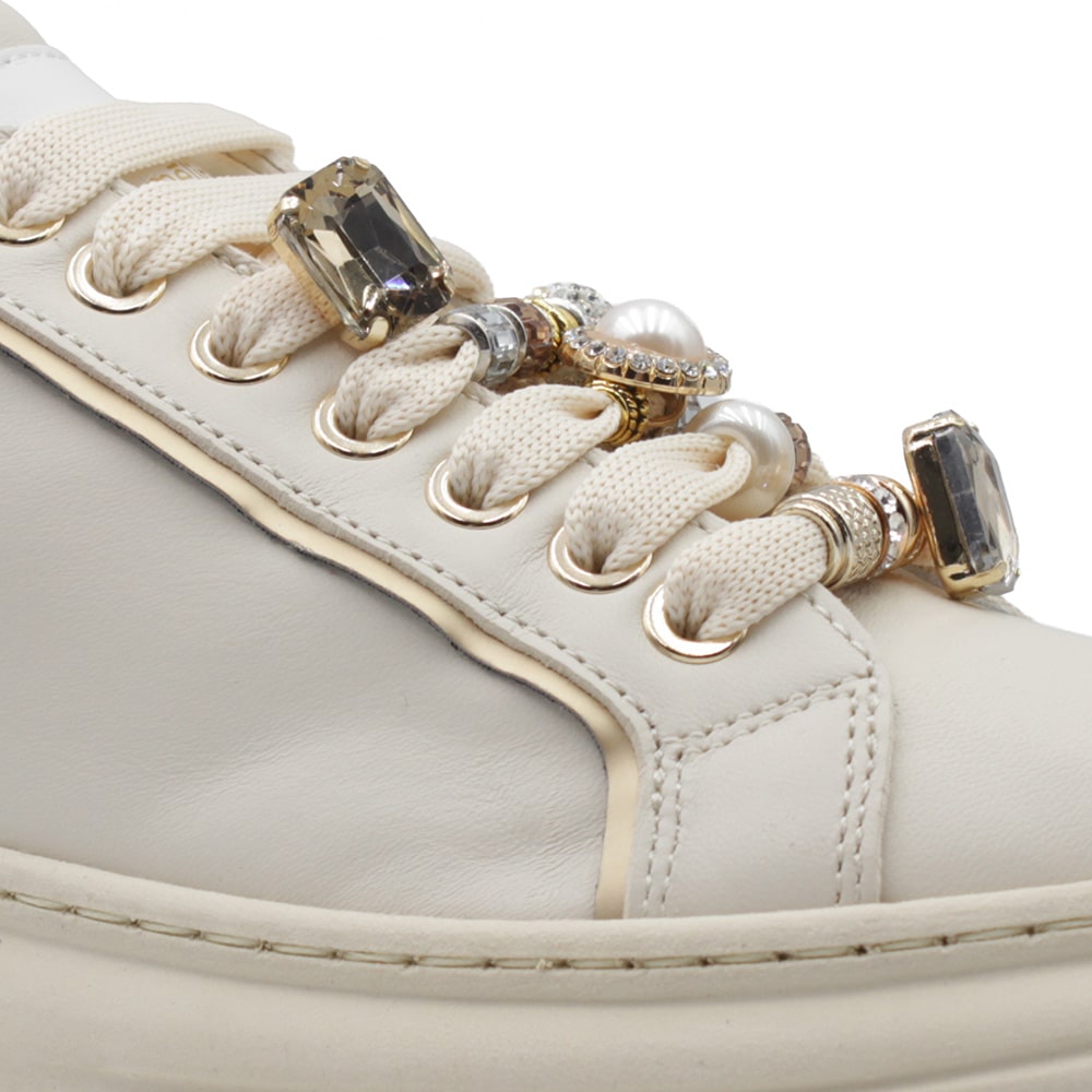 Sneakers donna MÉLINÉ in pelle di colore avorio con brillanti accesori in microstrass a forma cuore e topazio, riporti platino sul tallone. Laccio bianco a contrasto. Calzatura perfetta per i tuoi outfit originali.