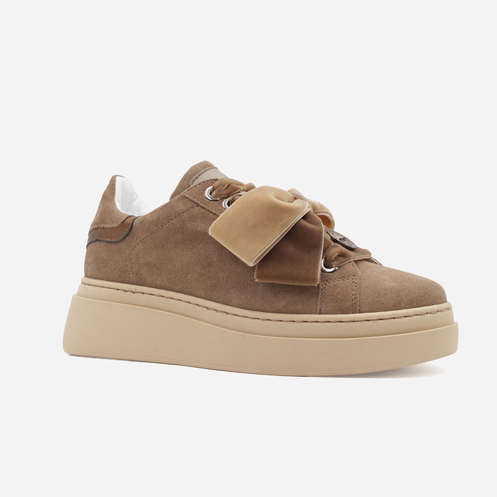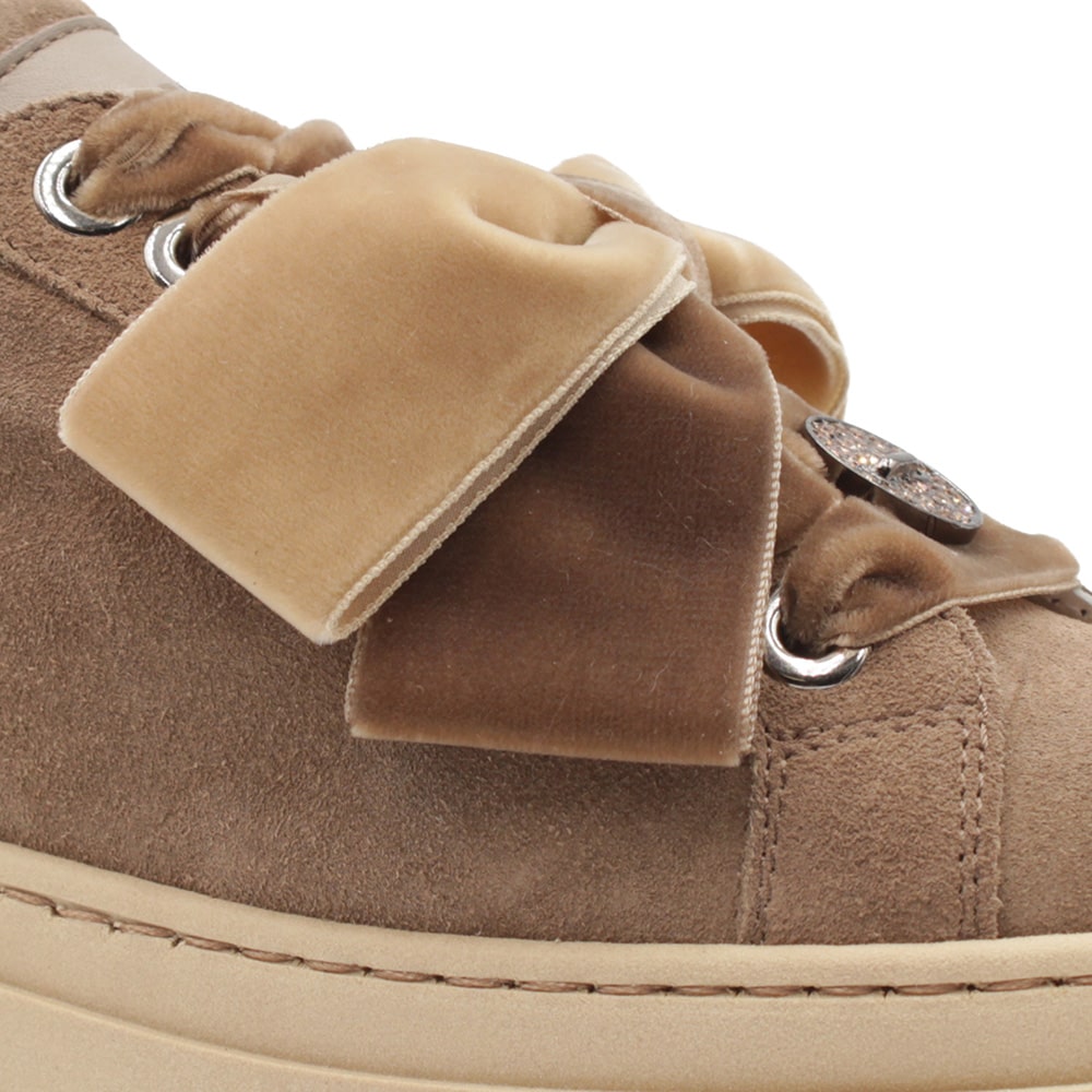 Sneakers donna MÉLINÉ in pelle scamosciata di colore malto con riporti in pelle di colore taupe. Lacci in raso e accessori gioiello sui lacci (in dotazione anche lacci in cotone tono su tono). Calzatura curata, elegante dal design conteporaneo perfetta per i tuoi outfit originali.