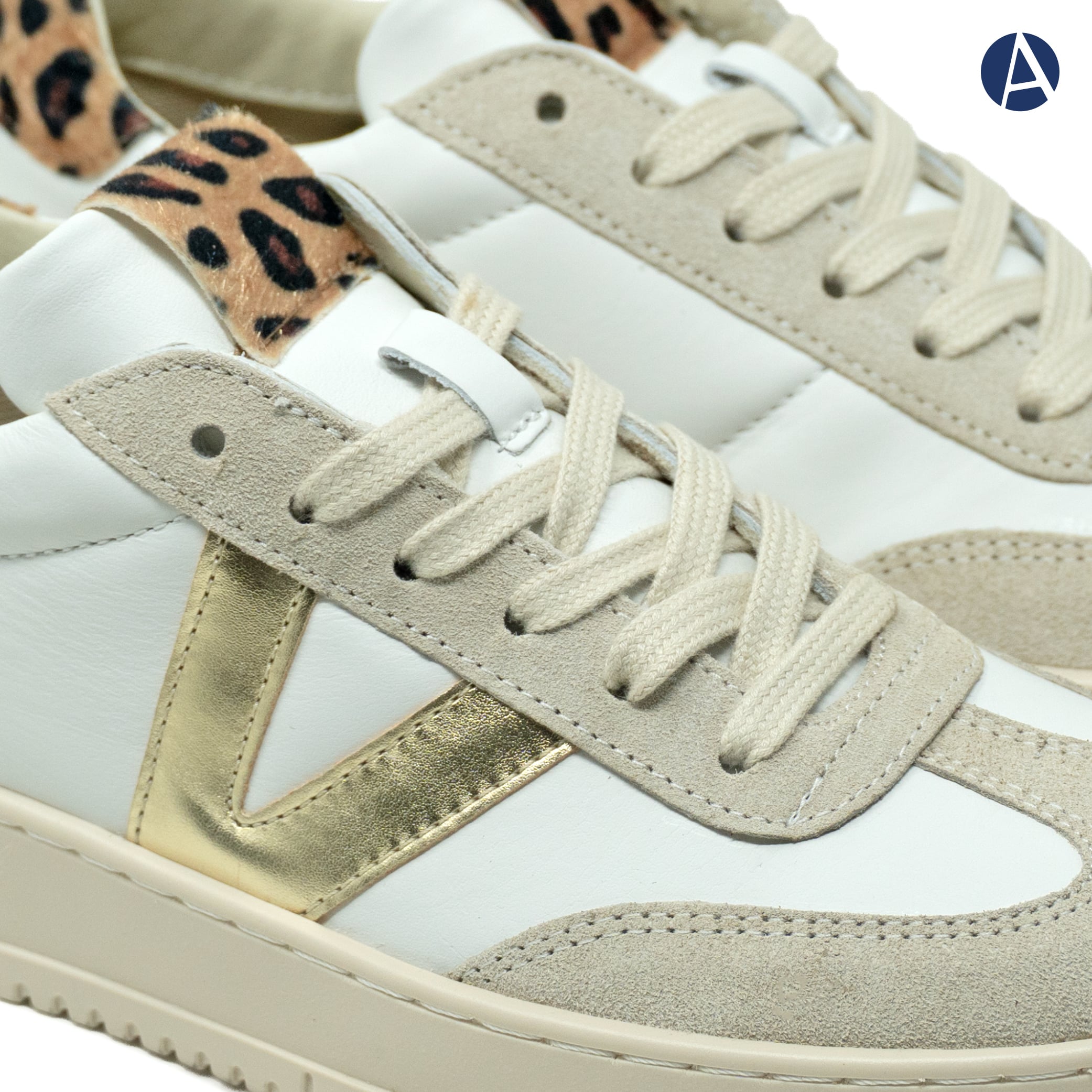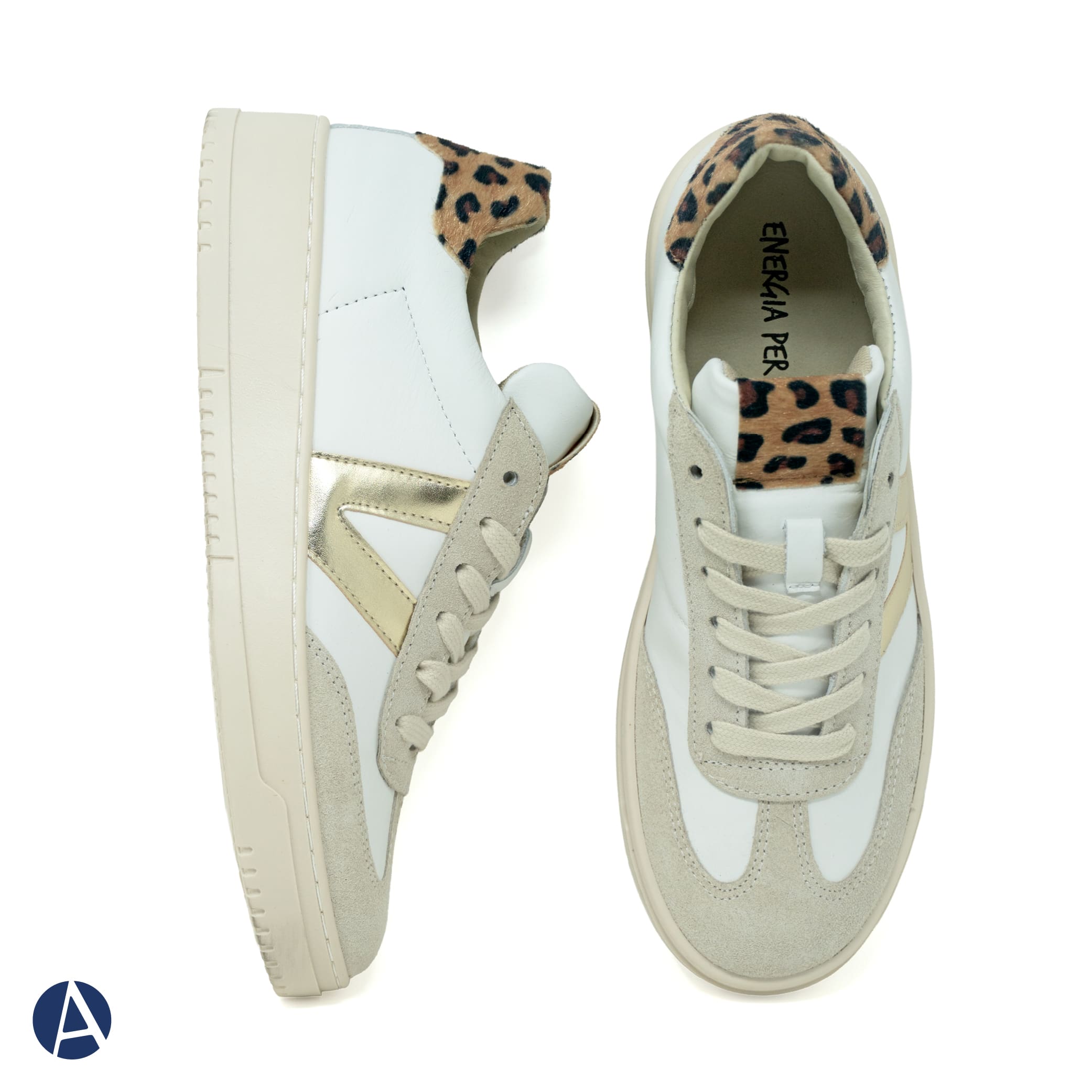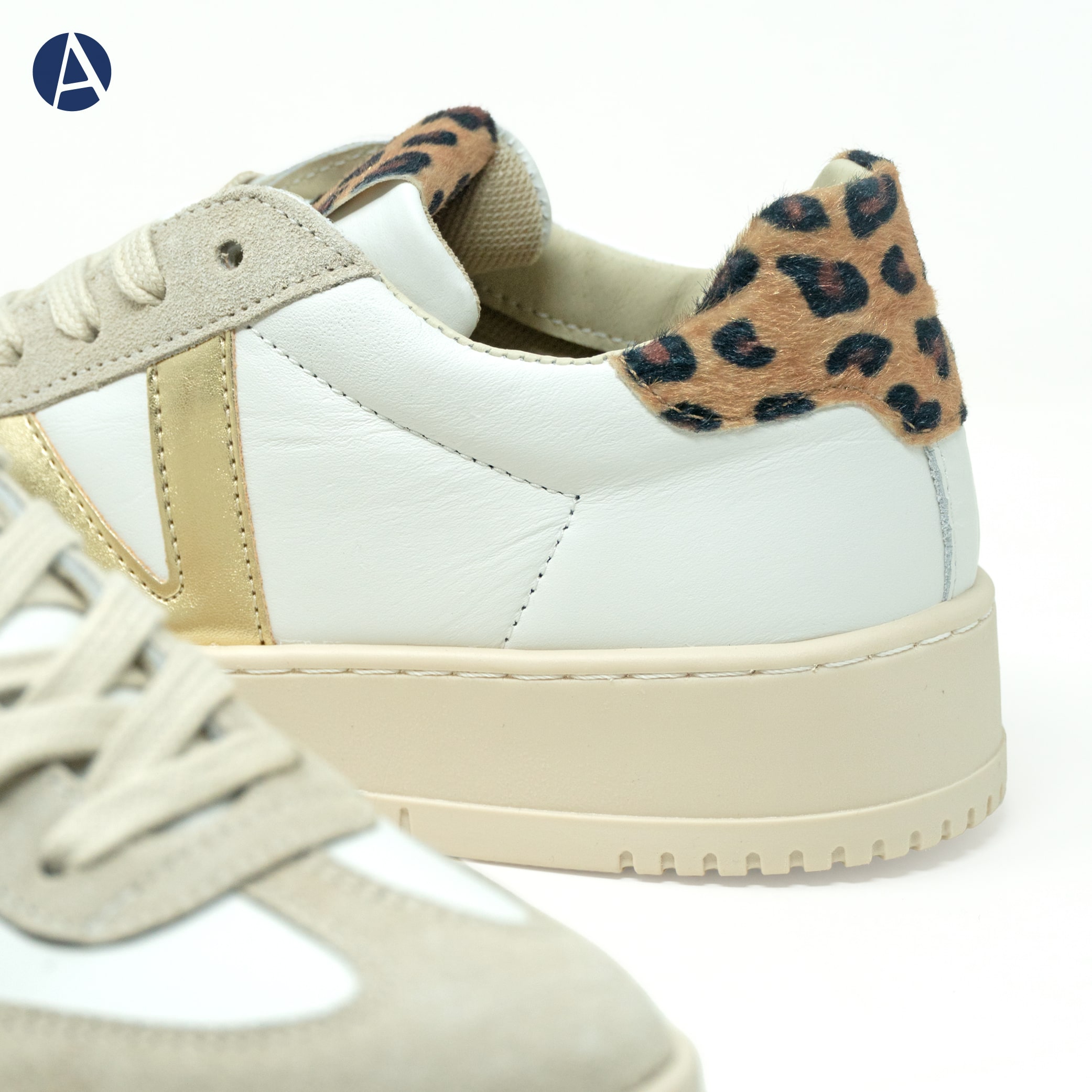 Sneakers donna VITAMINA TU in pelle di colore bianco e lacci a contrasto colore oro, punta traforata con inserti in pelle scamosciata beige, dettagli leopardati e glitter dorato sul tallone. Calzatura perfetta con i jeans ed outfit informali.