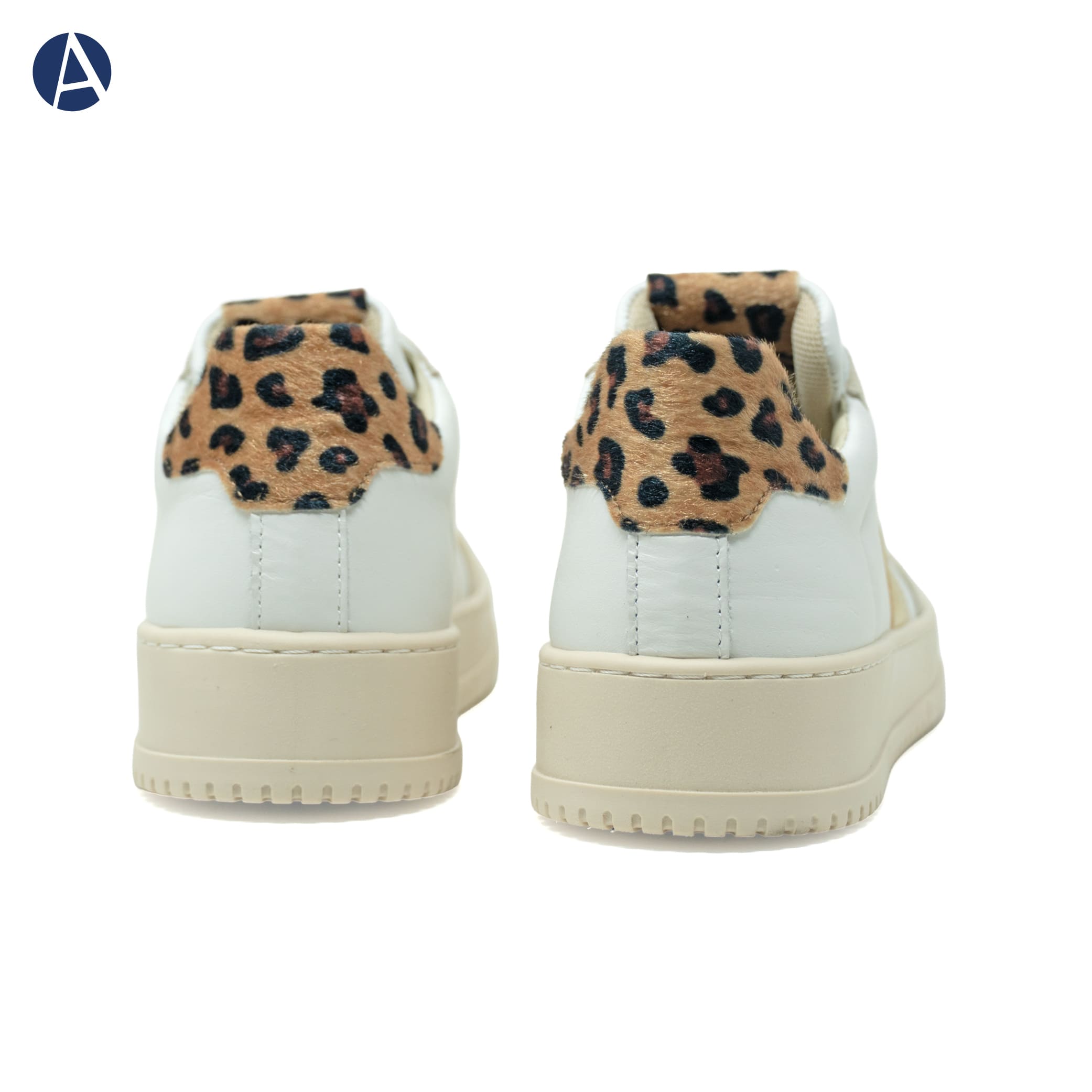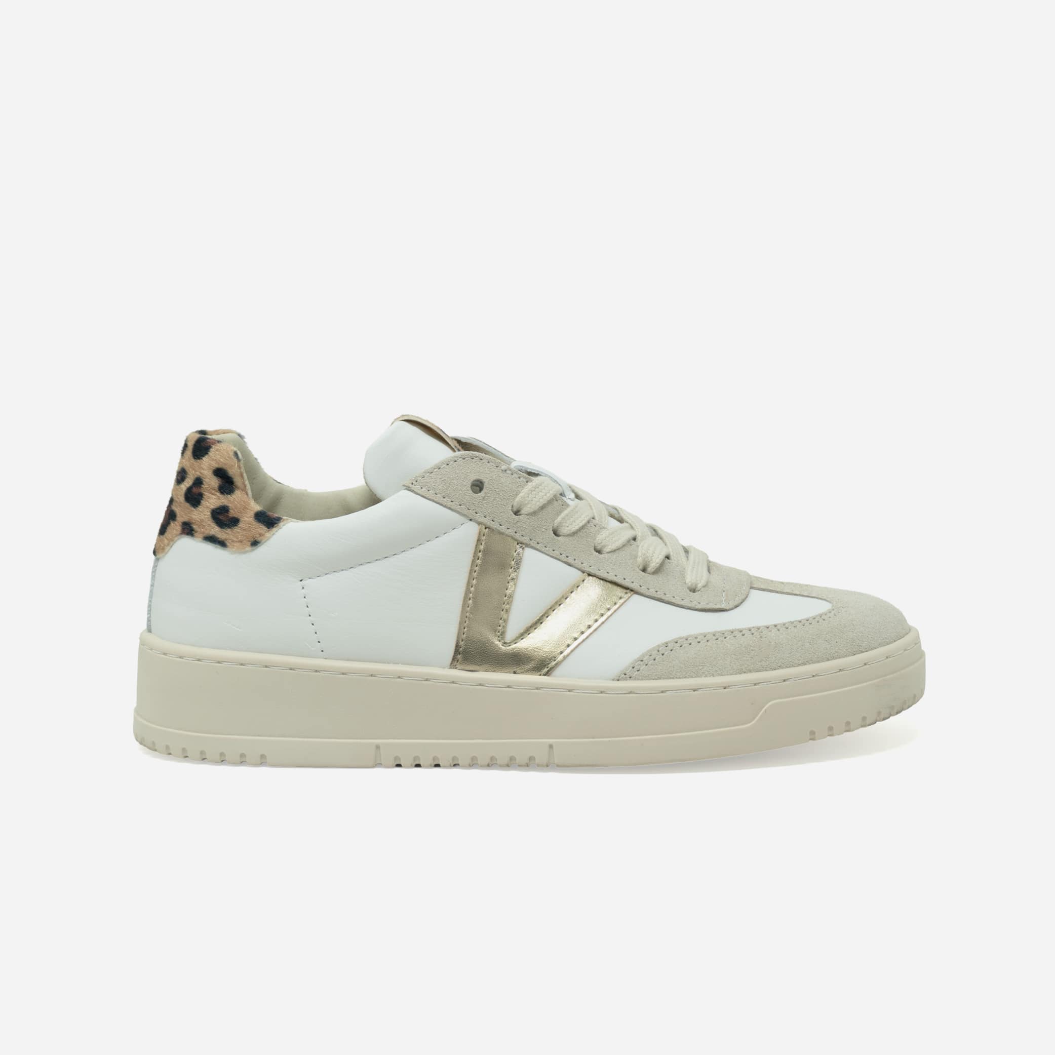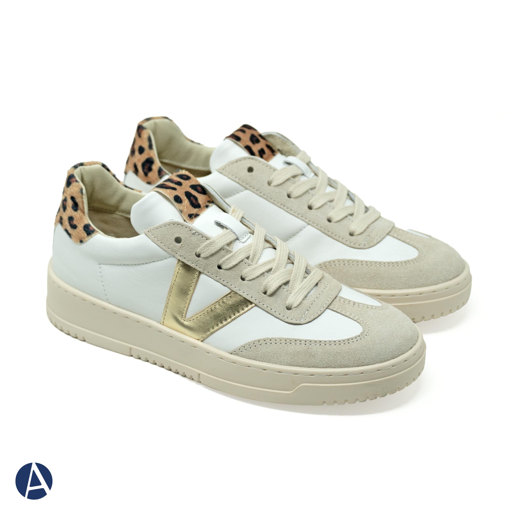 Sneakers donna VITAMINA TU in pelle di colore bianco e lacci a contrasto colore oro, punta traforata con inserti in pelle scamosciata beige, dettagli leopardati e glitter dorato sul tallone. Calzatura perfetta con i jeans ed outfit informali.