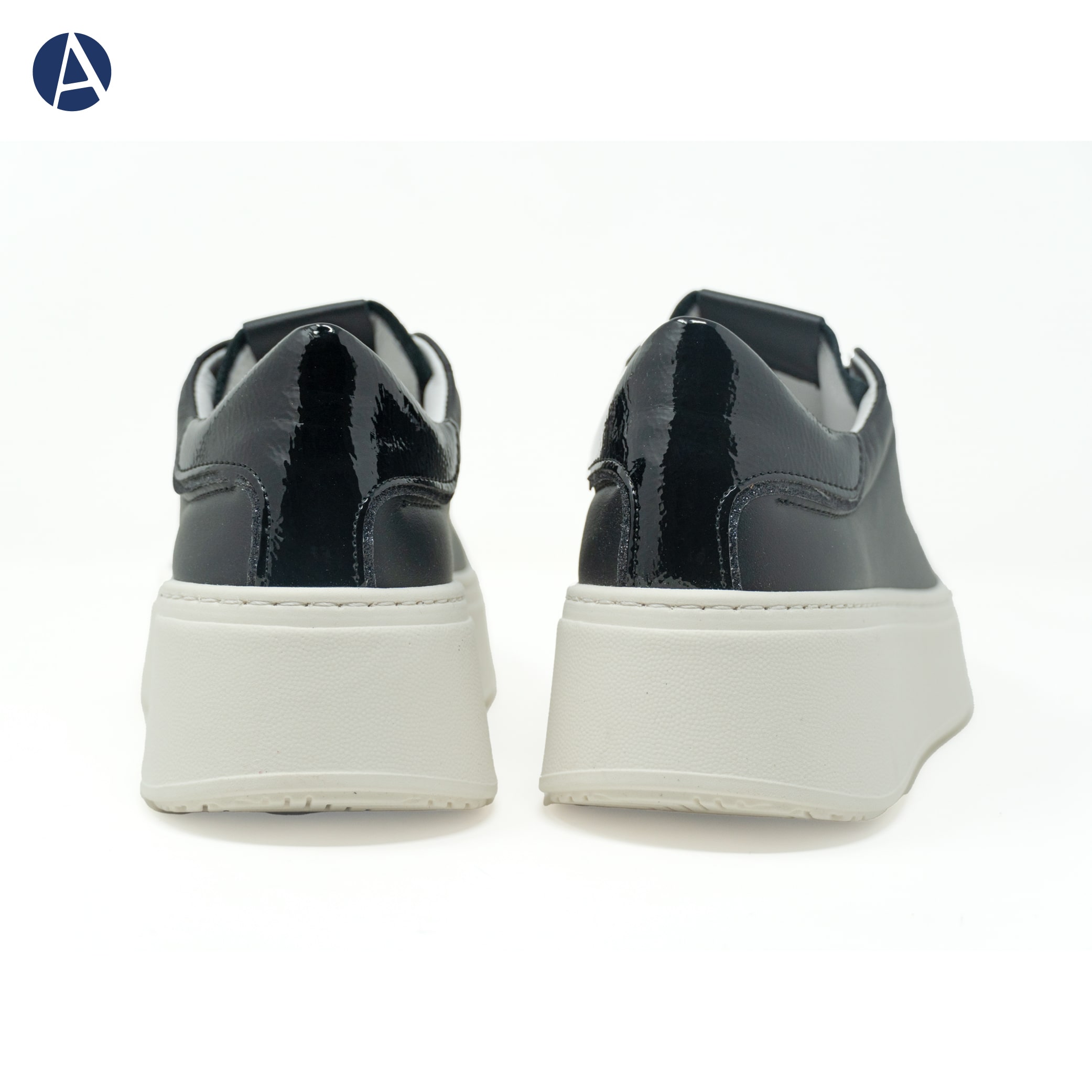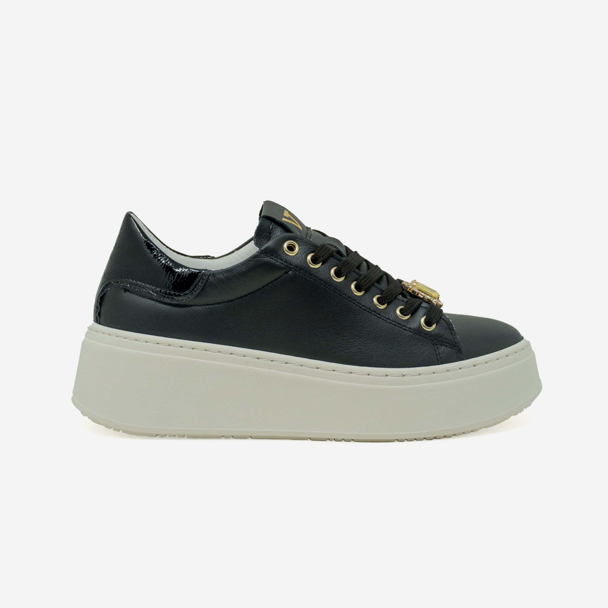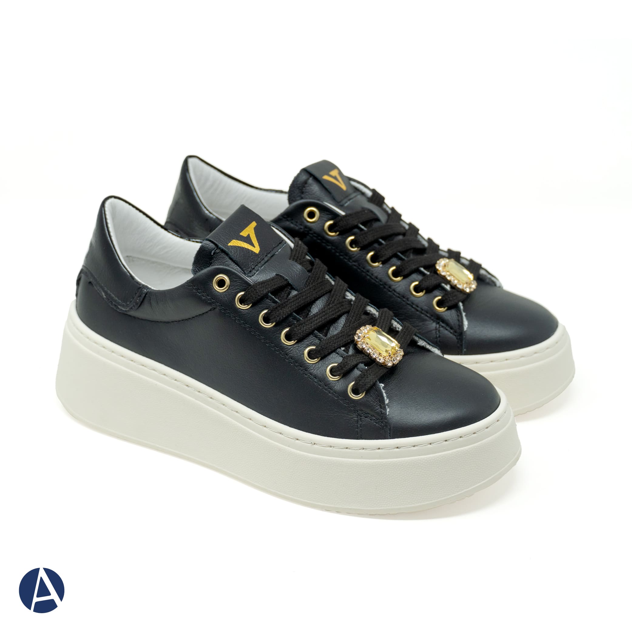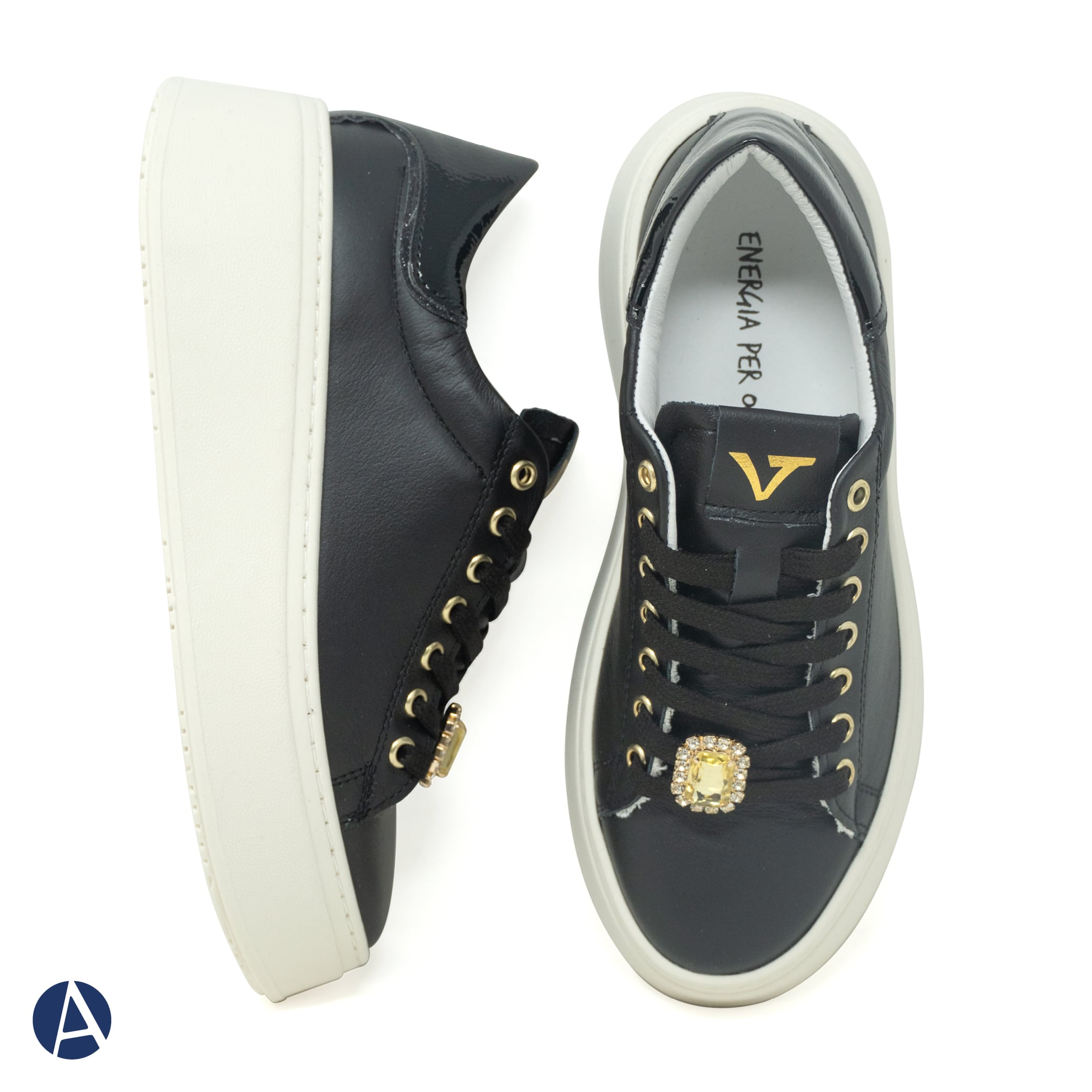 Sneakers donna VITAMINA TU in pelle scamosciata di colore nero con inserti in pelle bianca e riporto posteriore in glitter. Calzatura perfetta con i jeans ed outfit informali.