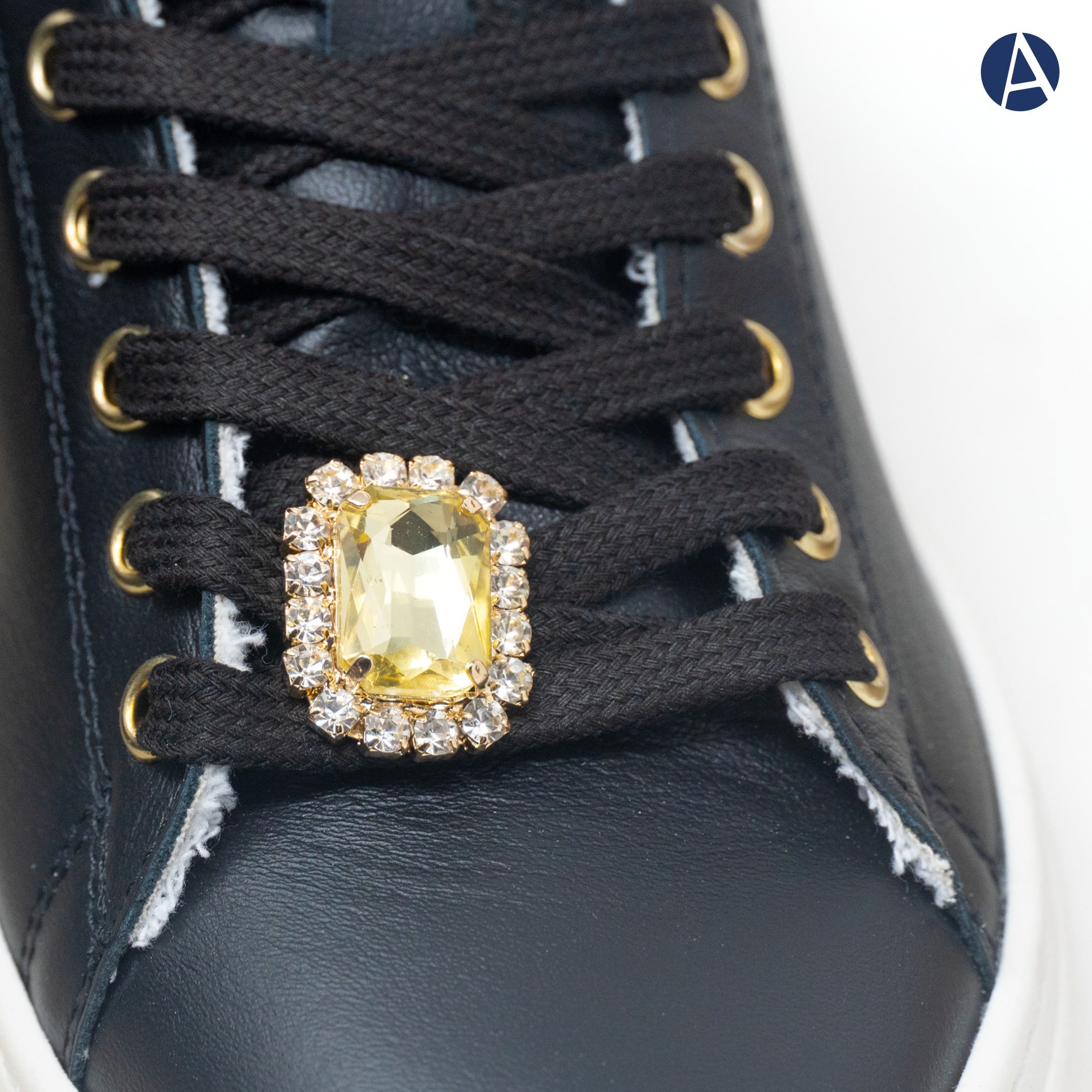 Sneakers donna VITAMINA TU in pelle scamosciata di colore cognac con accessori gioiello sui lacci in raso e inserto posteriore in glitter e platino. Calzatura perfetta con i jeans ed outfit informali.