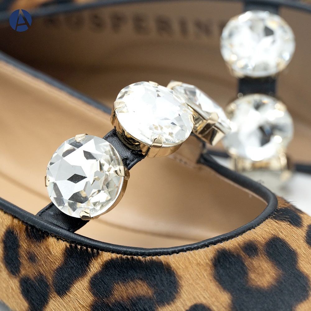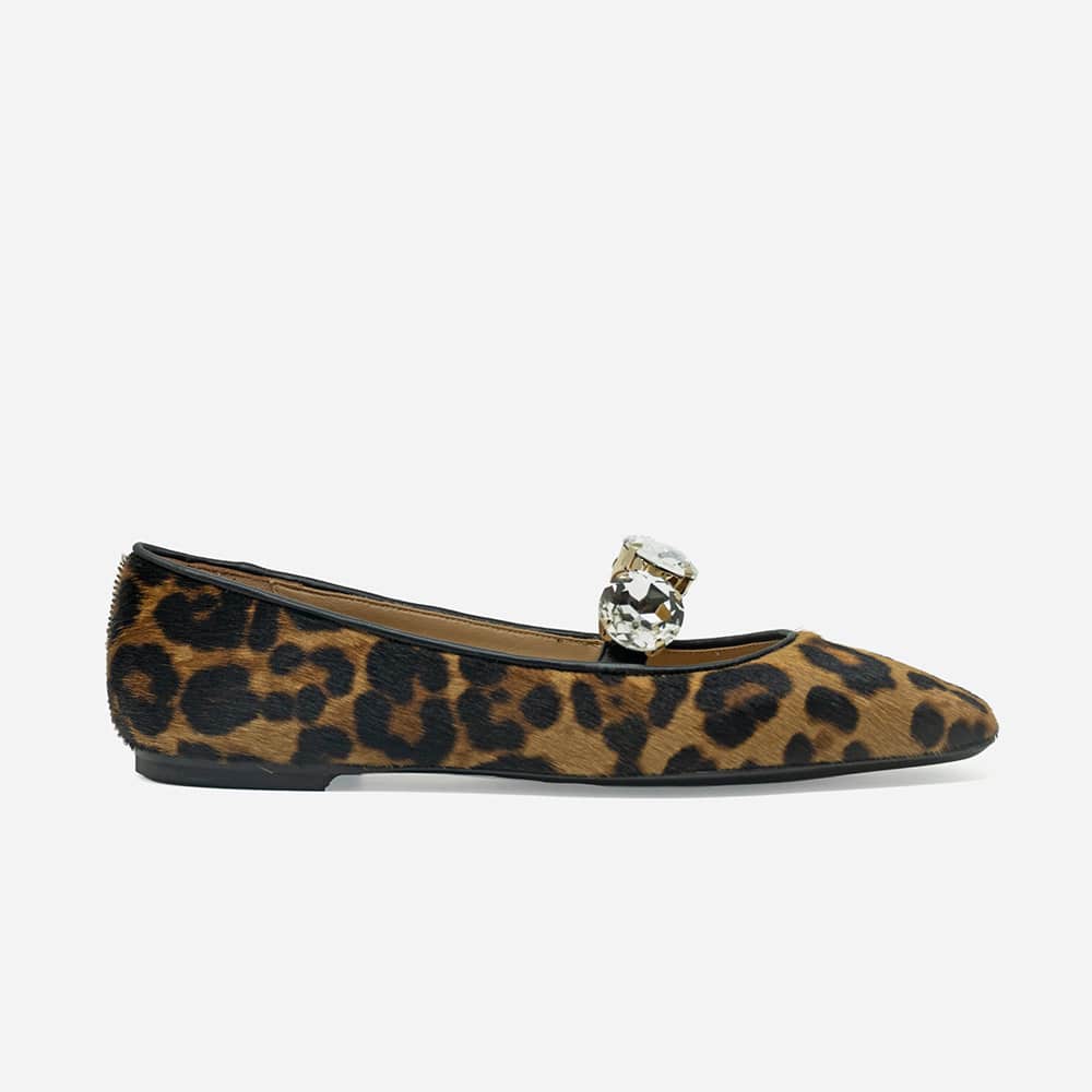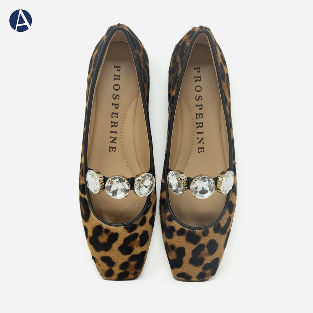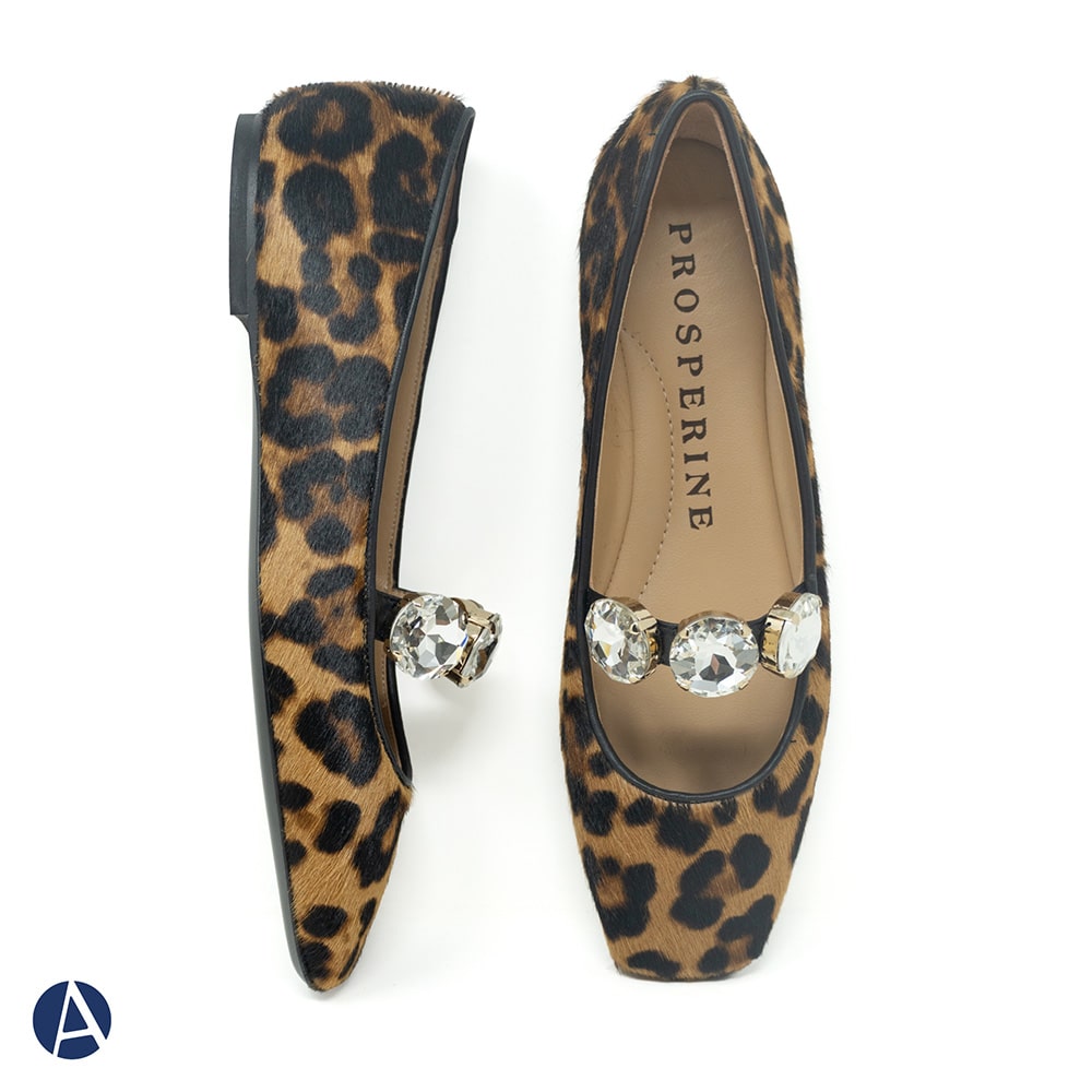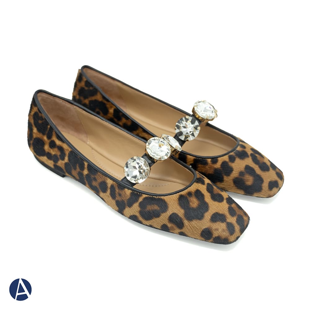 Ballerina Mary Jane donna Prosperine Prime in pelle stampata animalier, punta stondata con tre grandi gemme decorative sul cinturino, tacco basso da 1,5 cm e fondo cuoio antiscivolo. Calzature artigianali donna di alta qualità interamente MADE IN ITALY. Perfette per rendere i tuoi outfit unici e sofisticati!