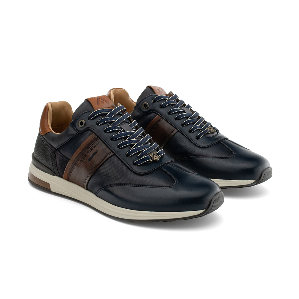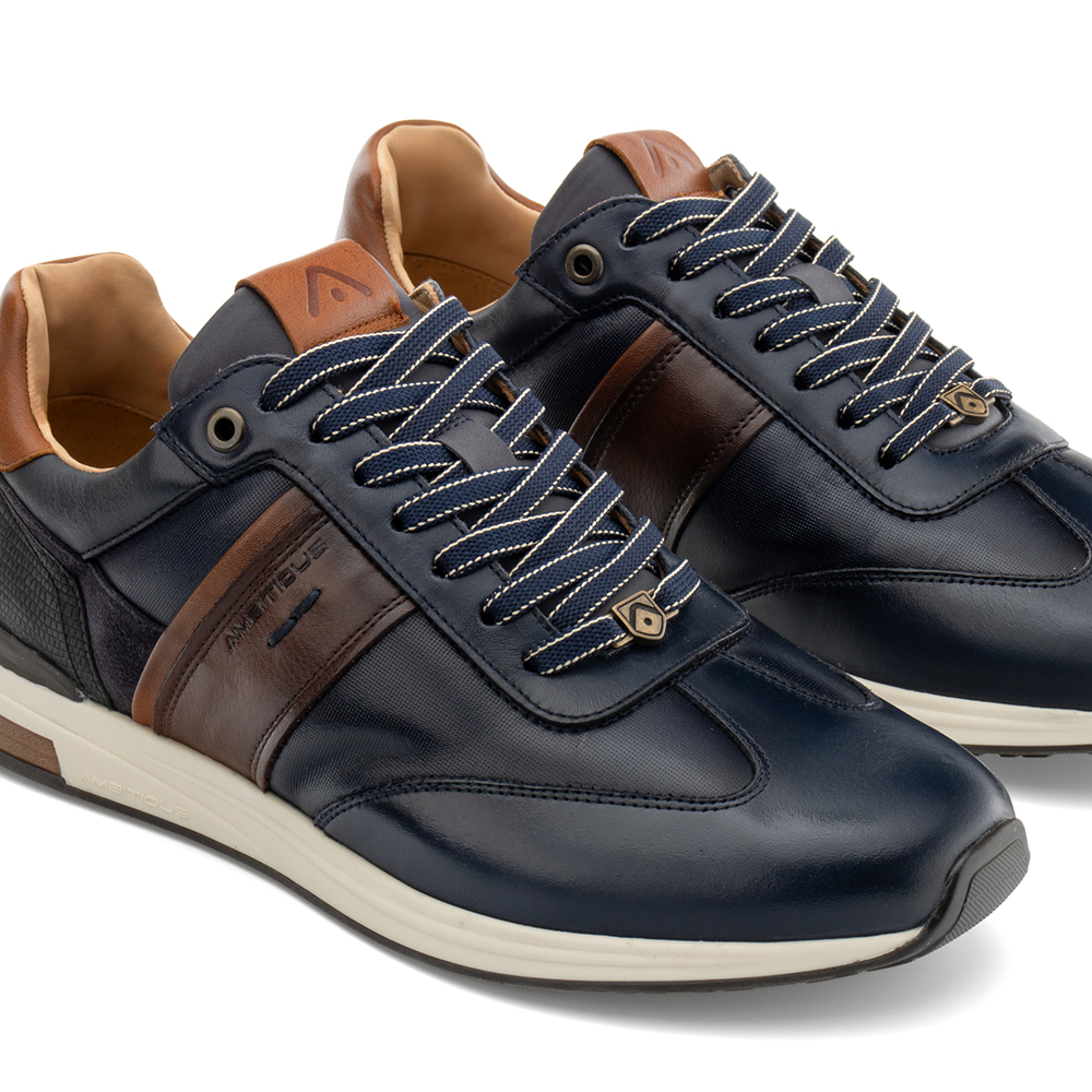Sneakers uomo AMBITIOUS Temple Zip in pelle di colore blu, lacci, riporti scamosciati e texture sul tallone con pratica zip laterale, per facilitare la calzata. Suola bicolore con elemento rinforzato a contrasto. Calzatura dalla silhouette unica per uno stile sportivo e casual.