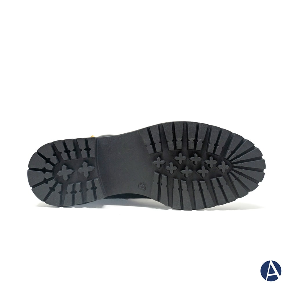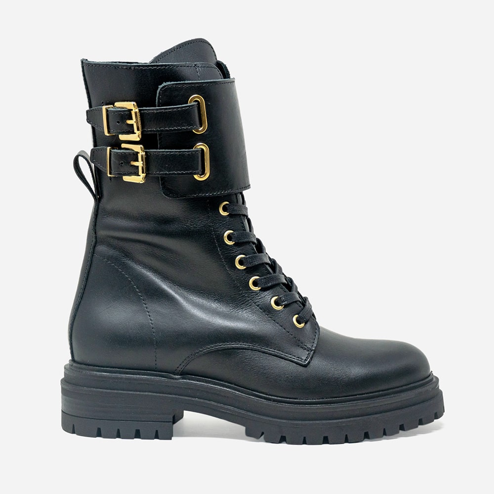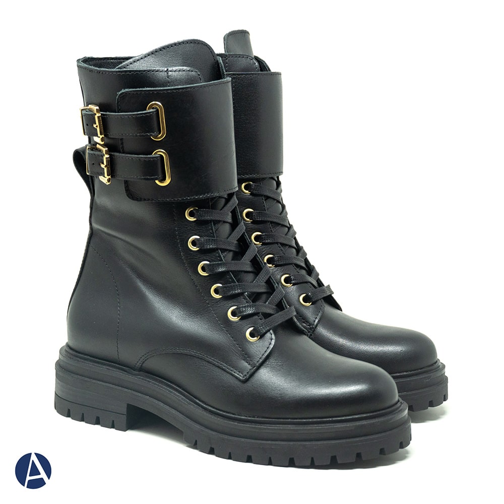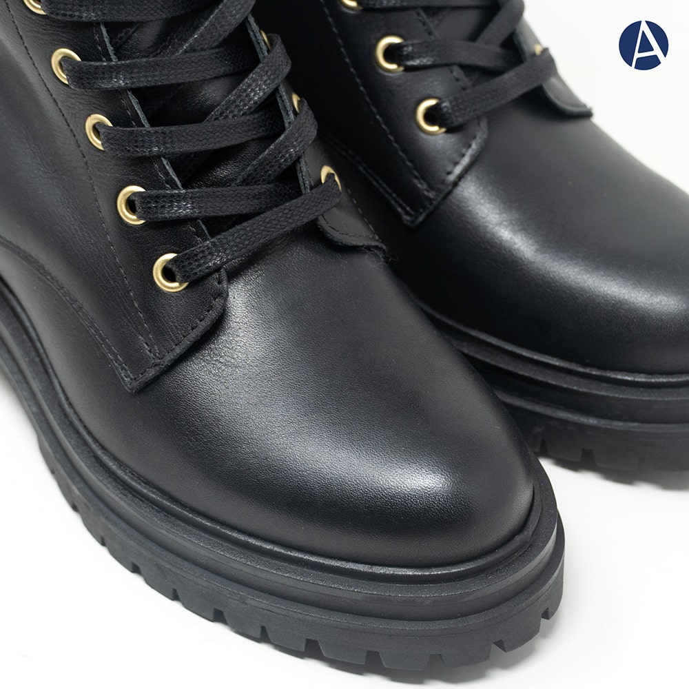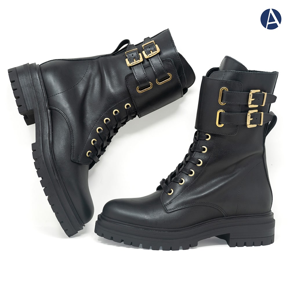 Anfibi donna Attili, in pelle di colore nero con lacci e zip laterale per facilitare la calzata, fondo carrarmato. Interamente MADE IN ITALY.