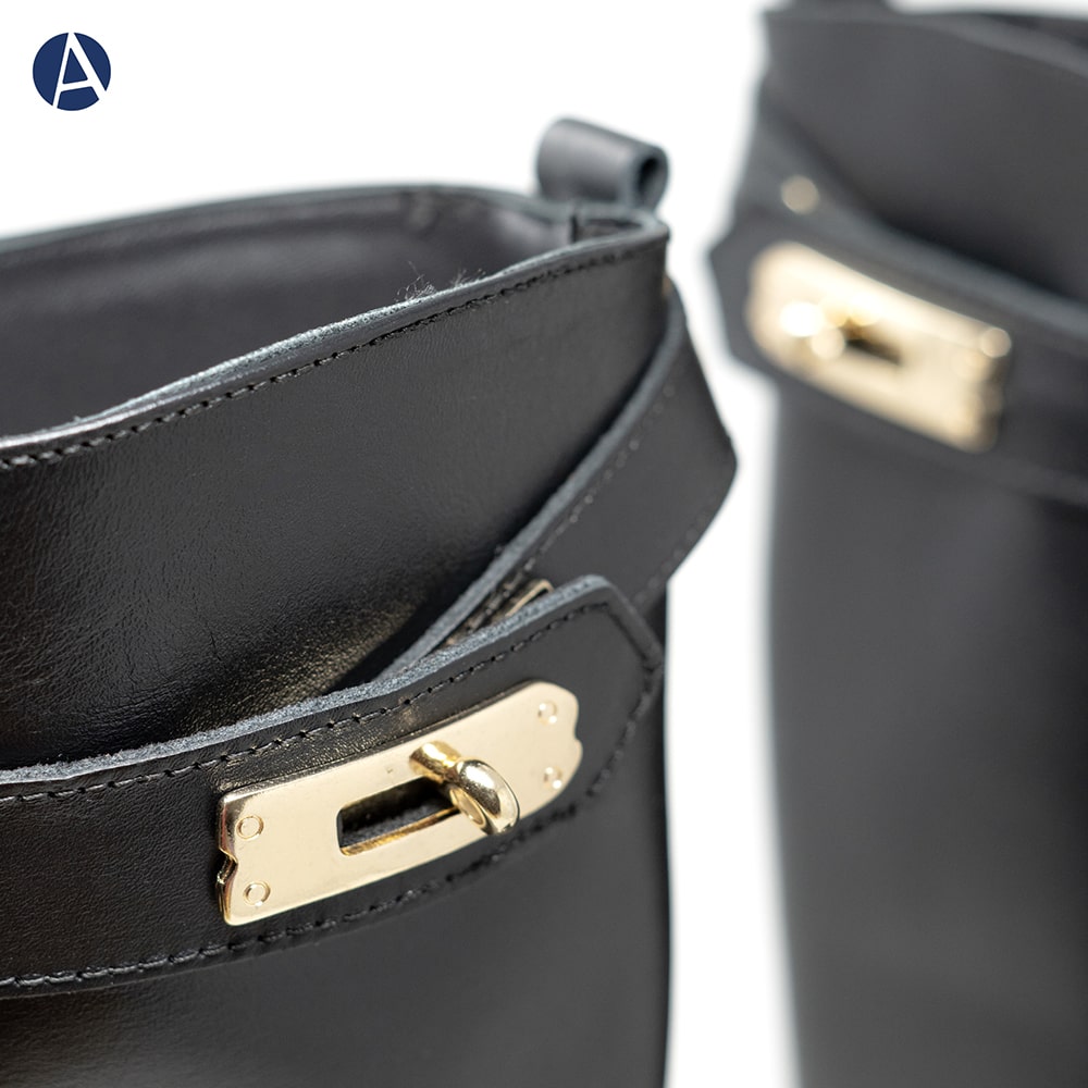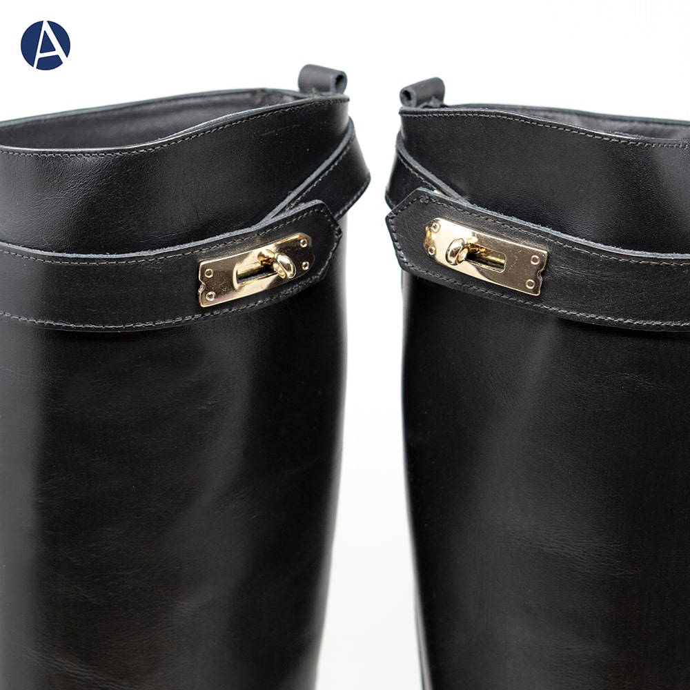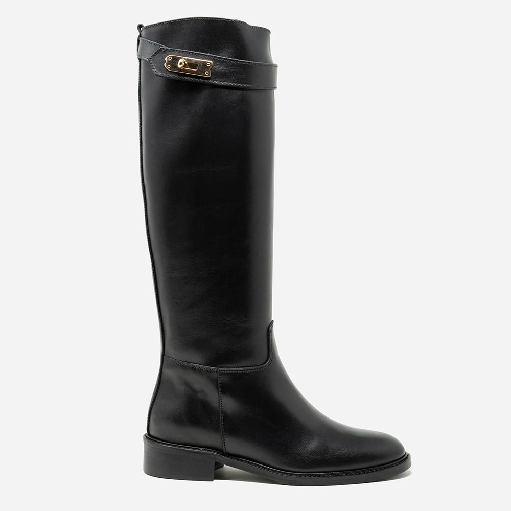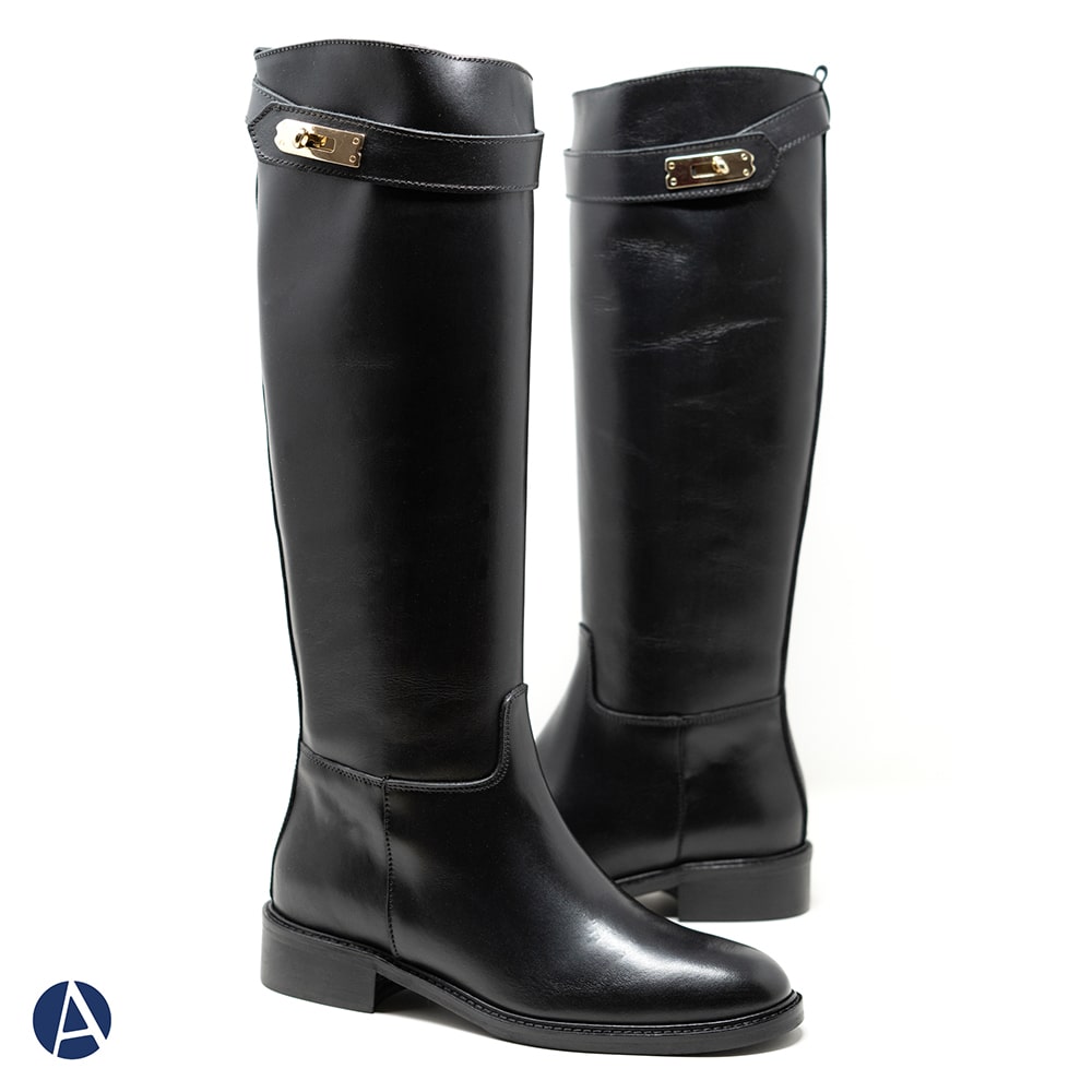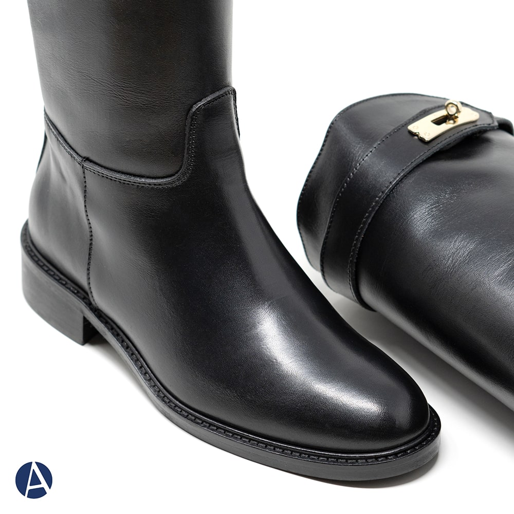 Stivale donna ATTILI in pelle di colore nero, caratterizzato da una cintina con chiusura dorata sulla parte superiore, fondo gomma, tacco basso. Calzatura interamente Made in Italy.
