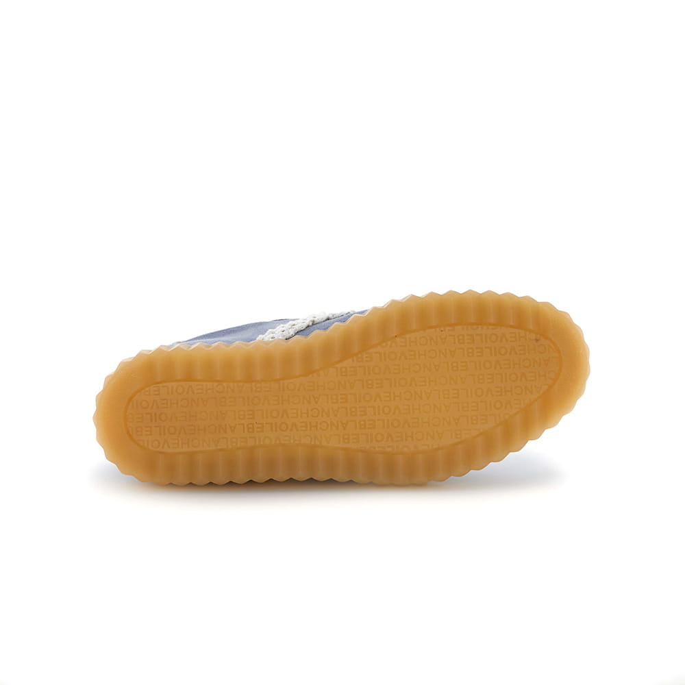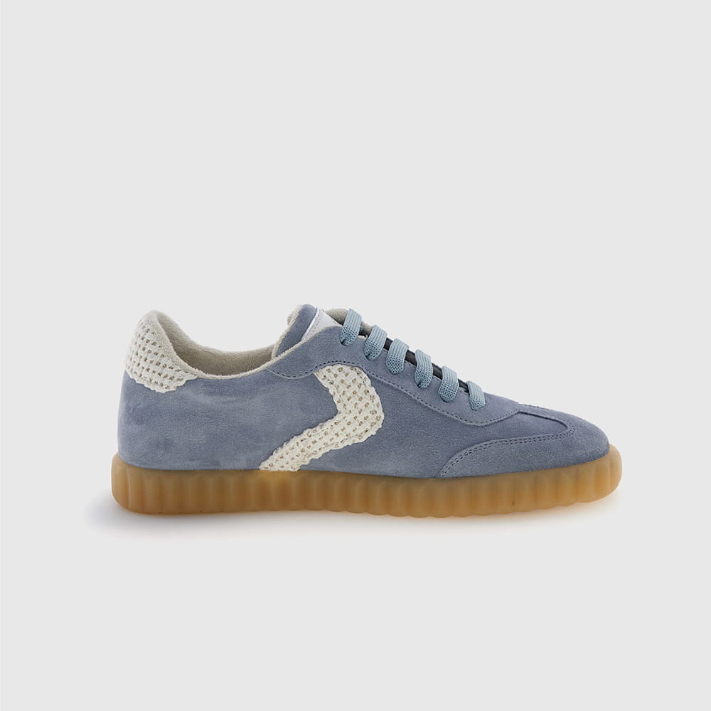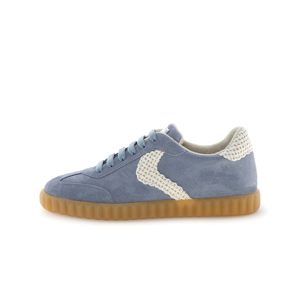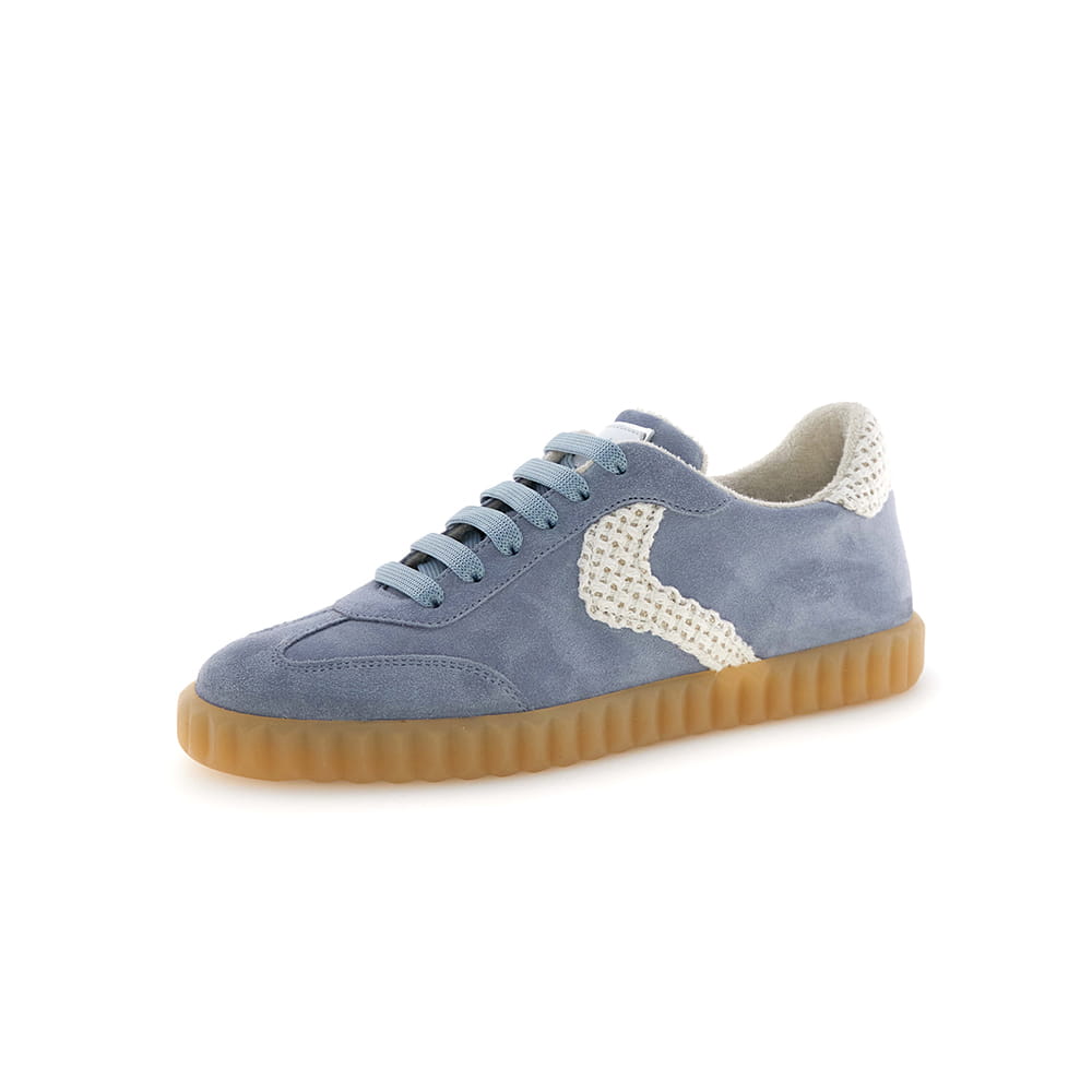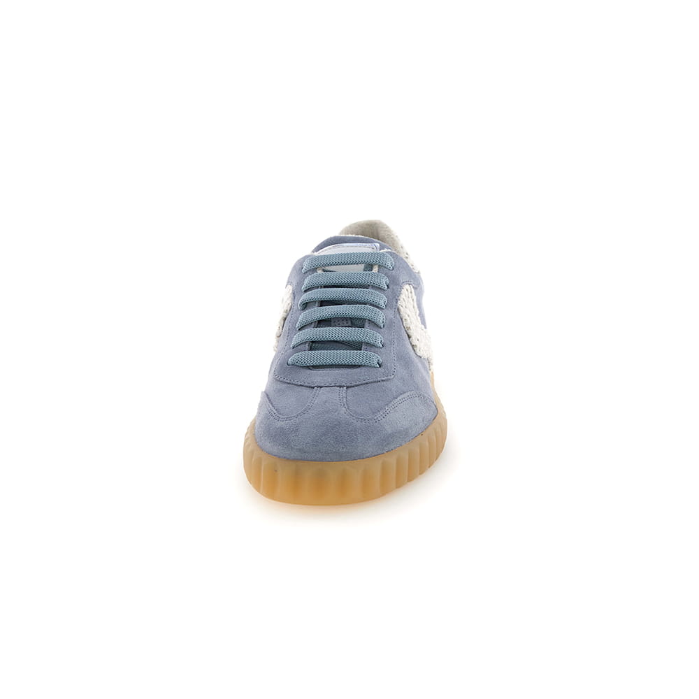 Sneakers donna Voile Blanche Ines in pelle scamosciata celeste con lacci in tinta. Dettagli laterali e sul tallone in tessuto crochet colore panna. Soletta interna estraibile e suola in para con bordo zigrinato.