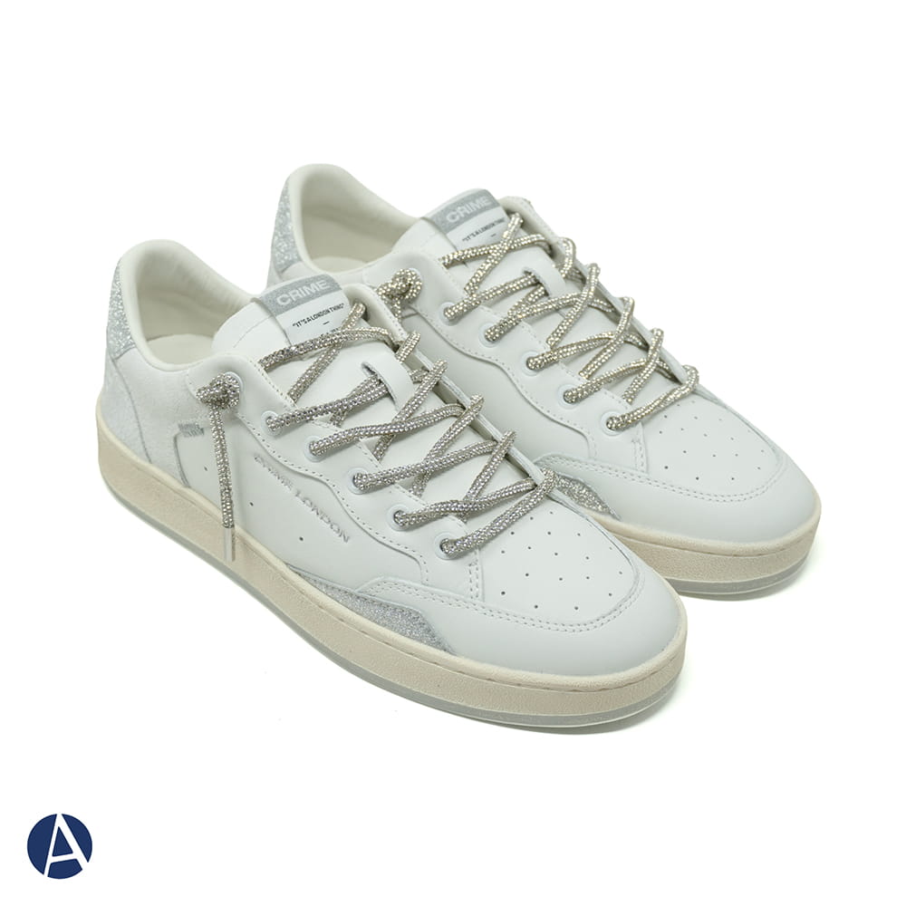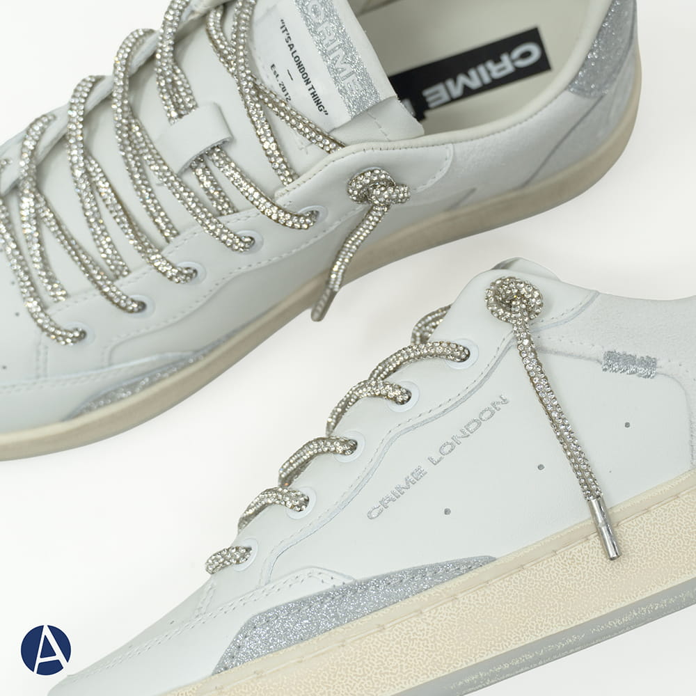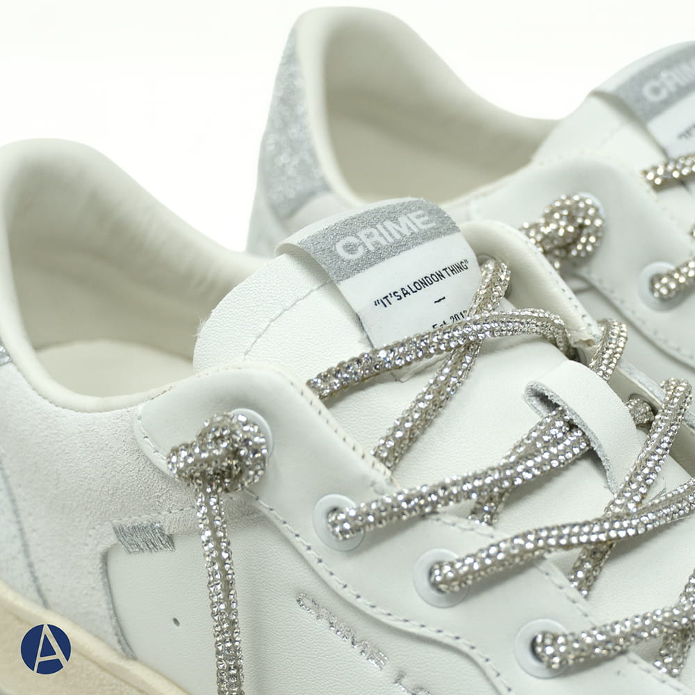 Sneakers donna Crime London Elevate Black Gems in pelle bianca con lacci, particolare di strass neri sul tallone con logo argento, tomaia in pelle italiana di alta qualità. Versatile e adatta ad ogni occasione. Realizzata con materiali di alta qualità Made in Italy.