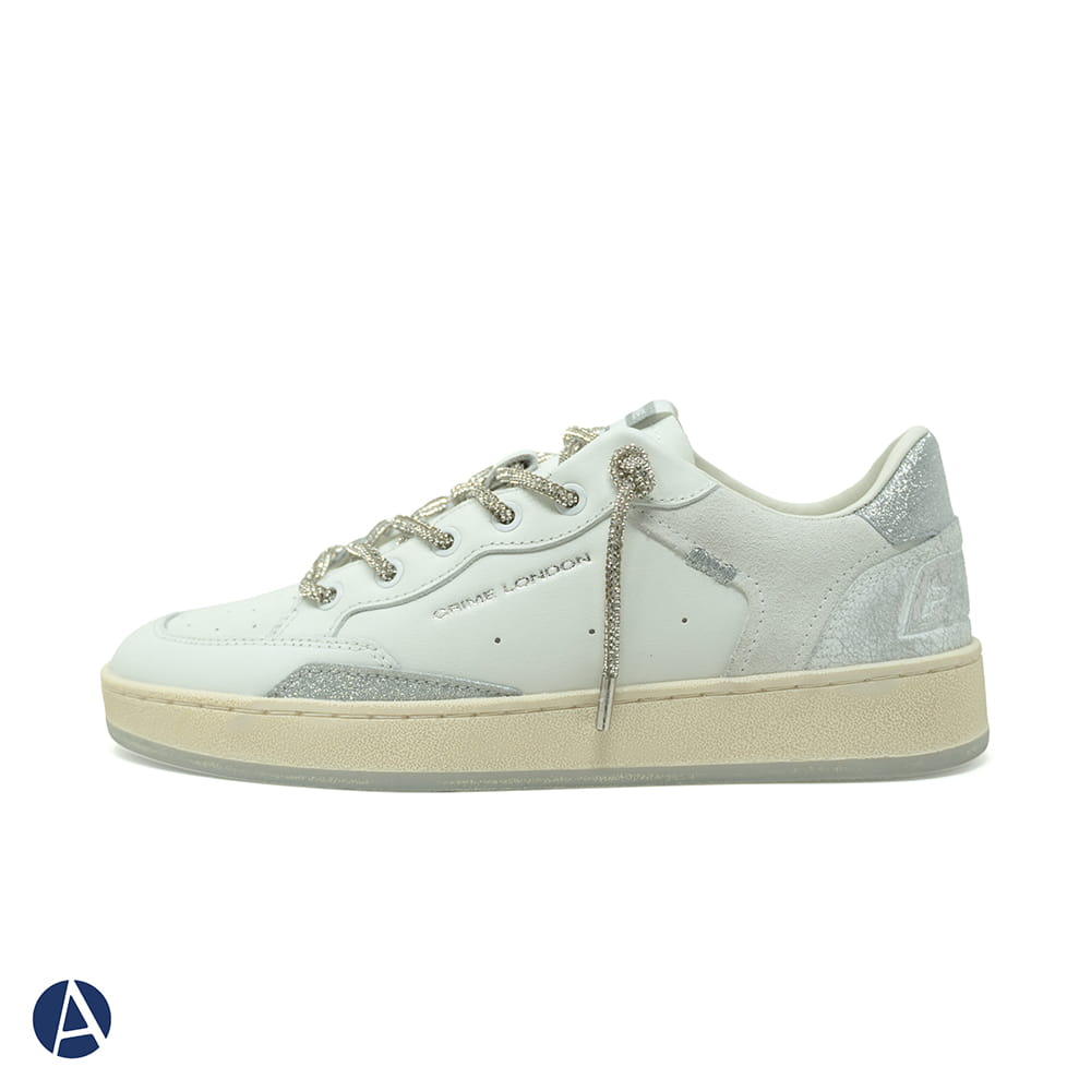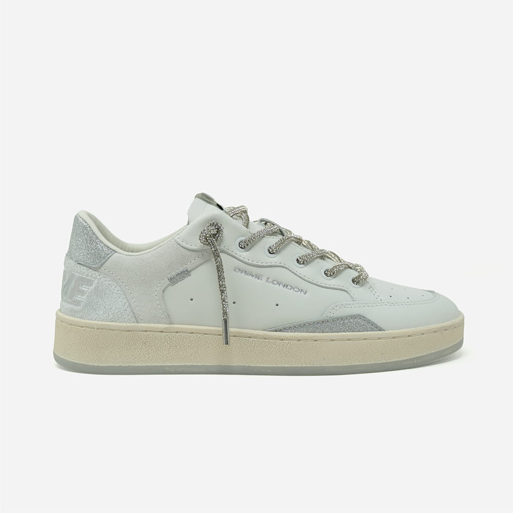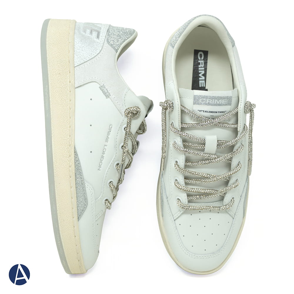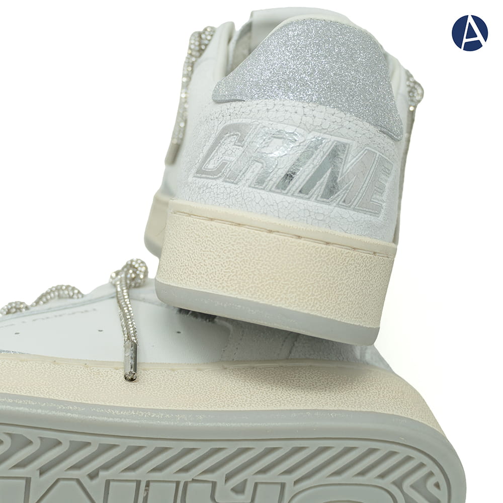 Sneakers donna Crime London Elevate Black Gems in pelle bianca con lacci, particolare di strass neri sul tallone con logo argento, tomaia in pelle italiana di alta qualità. Versatile e adatta ad ogni occasione. Realizzata con materiali di alta qualità Made in Italy.