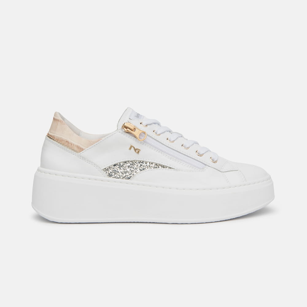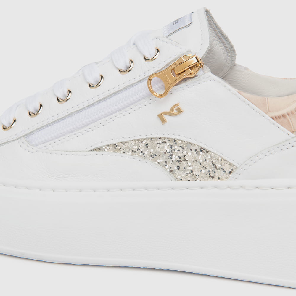 Sneakers donna NeroGiardini in pelle avorio con lacci a contrasto, riporti scamosciati di colore laminato bronzo, glitter e nude sul tallone, impreziositi da dettaglio oro che rendono la calzatura femminile e glamour. Soletta in memory che si modella delicatamente al piede. Sneakers estremamente comode da indossare tutto il giorno, realizzate con materiali di alta qualità. MADE IN ITALY