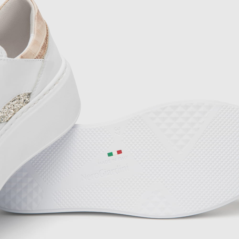 Sneakers donna NeroGiardini in pelle bianca, bande laterali colore platino con logo metallico e imbottitura sul tallone a contrasto platino. Fondo a cassetta colore miele. Calzatura originale e dallo stile inconfondibile realizzate con materiali di alta qualità, comode da indossare tutto il giorno . MADE IN ITALY