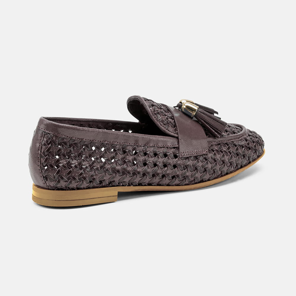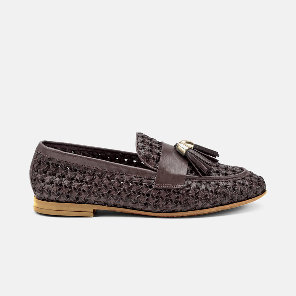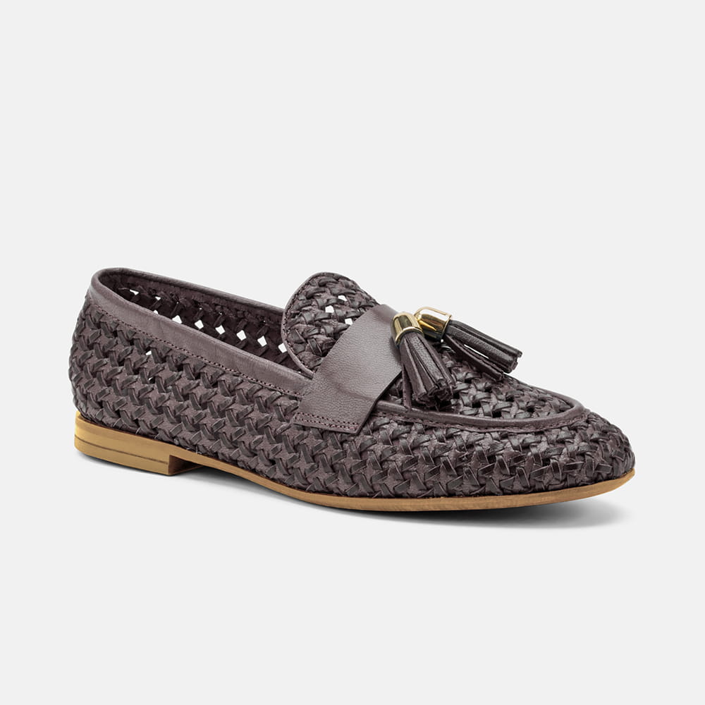 Mocassino Frau donna in pelle intrecciata di colore beige con nappine. Calzatura raffinata e moderna dalle caratteristiche uniche. Qualità made in Italy.