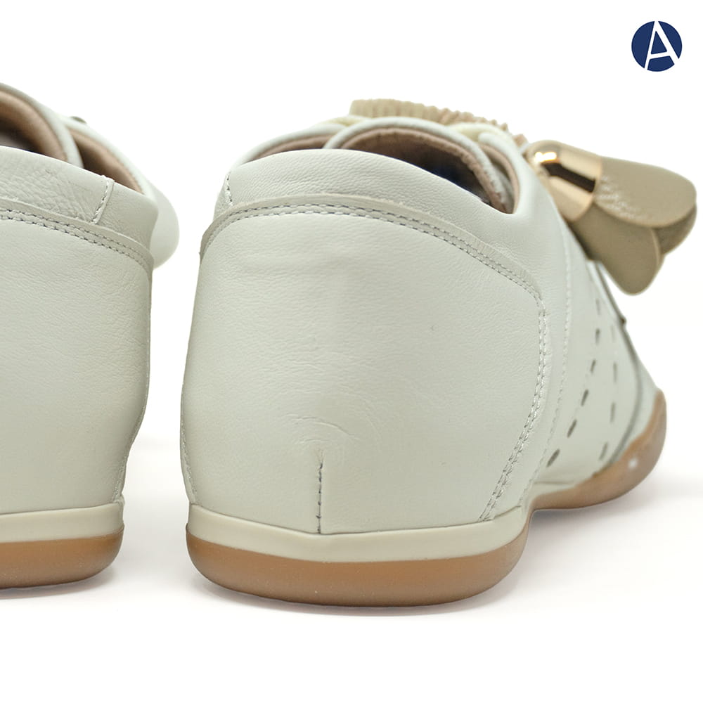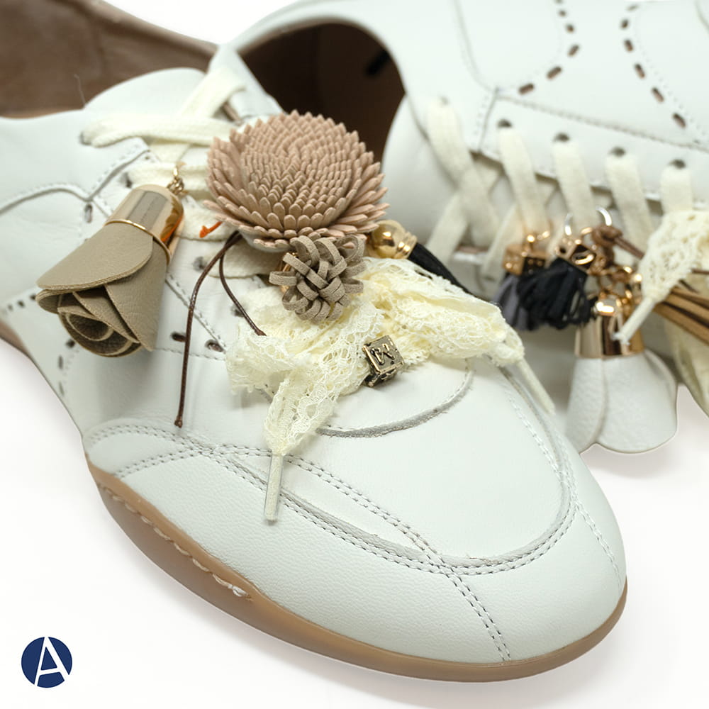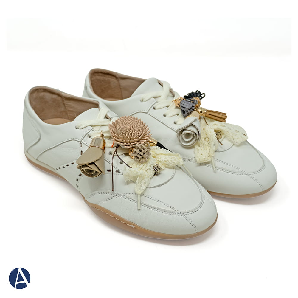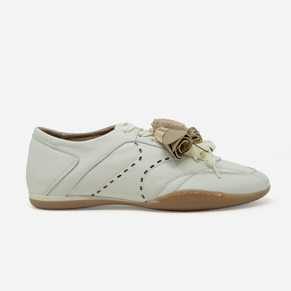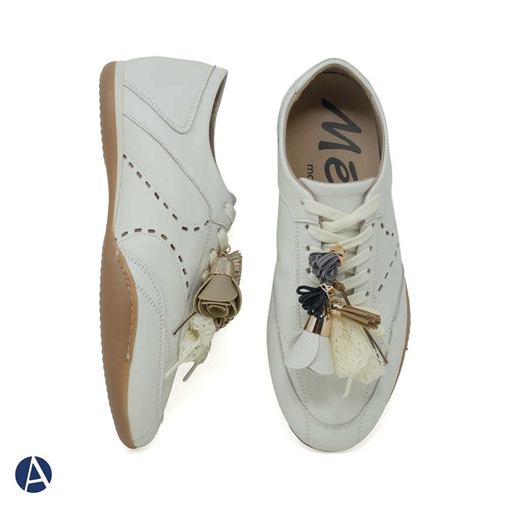 Sneakers donna MÉLINÉ in pelle di colore avorio con riporti colore platino. Lacci in cotone con accessori gioiello sui lacci. Calzatura curata, elegante dal design contemporaneo perfetta per i tuoi outfit originali.