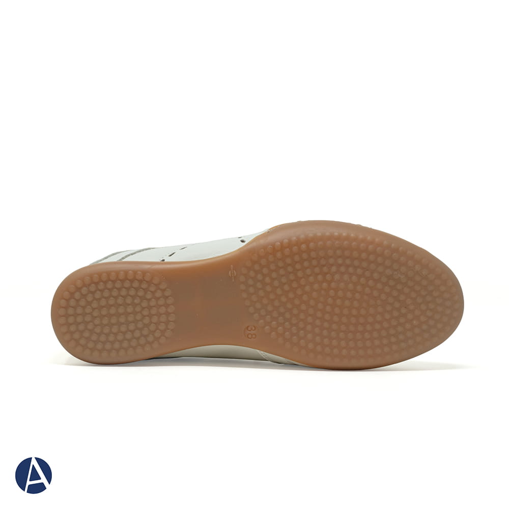 Sneakers donna MÉLINÉ in pelle di colore bianco con decorazioni di perle sulla linguetta, riporti sul tallone verdi e platino. Laccio particolare a contrasto. Calzatura perfetta per i tuoi outfit originali.